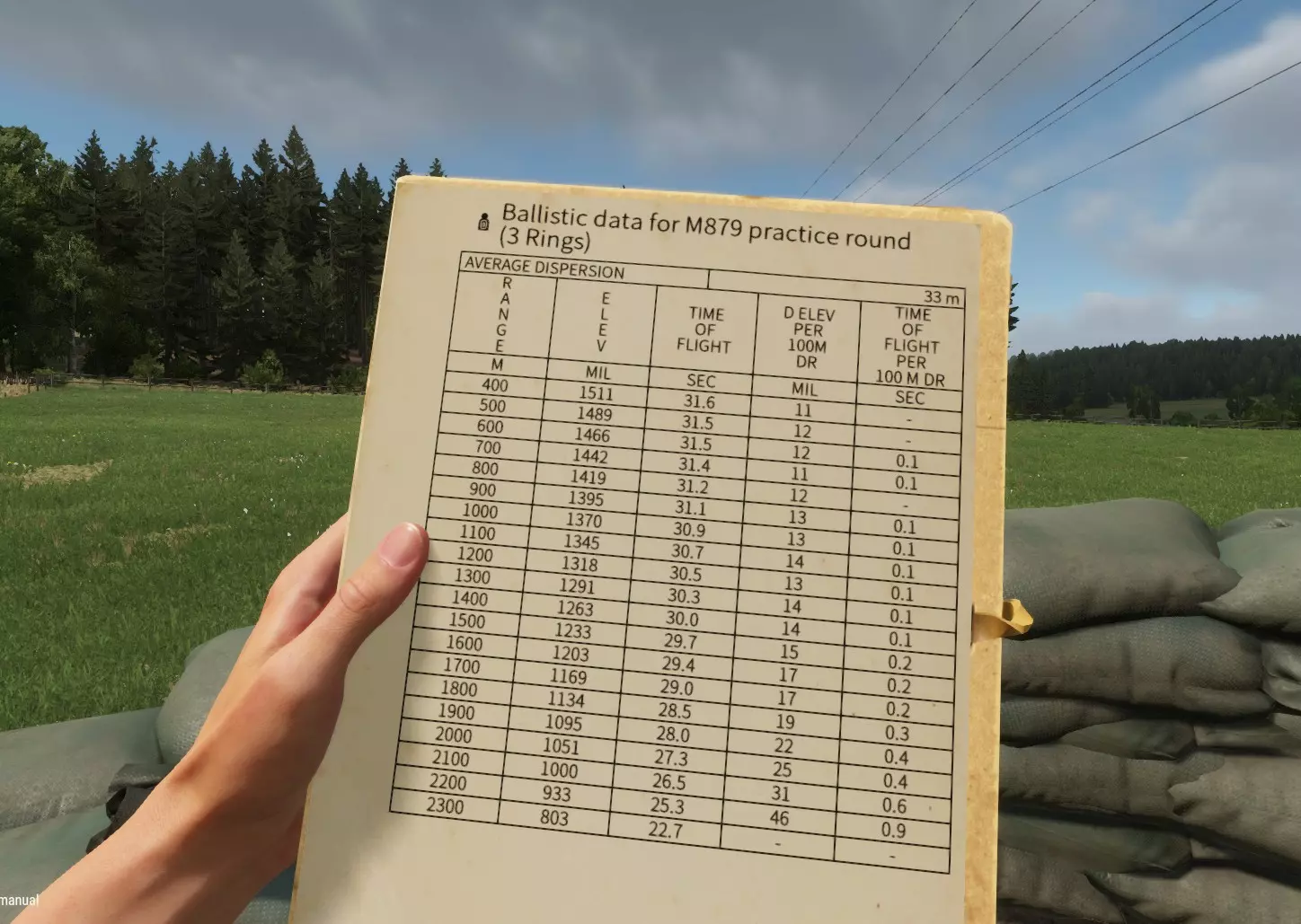 美军弹道手册 这份美军弹道手册,我习惯称之为迫击炮参数表,上面标注了炮弹的大致散布范围、每100米距离对应的仰角(以毫弧度为单位)、飞行时间、每100米高程差所需的毫弧度调整量,以及每100米高程差对应的飞行时间调整量(最后这项其实无需特别留意)。 该参数表针对每100米射程提供了上述所有信息。你可以通过查看手册并翻阅页面两侧来更换炮弹类型和引信环数。