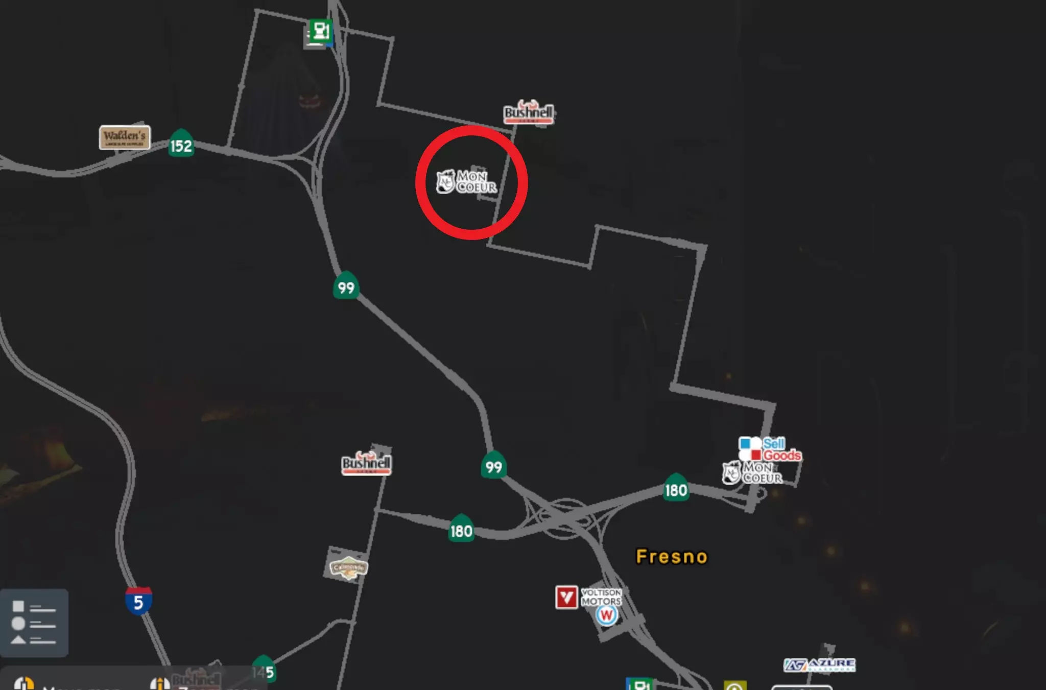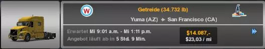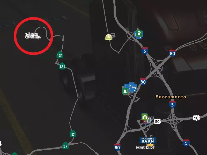恭喜! 从加利福尼亚州的所有3个葡萄园运送货物 这个成就有点棘手,尤其是如果你已经拥有其他DLC的话。因为你需要在加利福尼亚州境内运送货物。 同时(2022年5月17日)SCS对该成就进行了修改。随着加利福尼亚重制更新(2024年10月28日)又有另一项改动。现在你需要从以下地点运送货物: 圣地亚哥 - 蒙科尔 萨克拉门托 - 蒙科尔 尤凯亚 - 蒙科尔 弗雷斯诺 - 蒙科尔 你需要从中运送货物的公司名为“蒙科尔”: