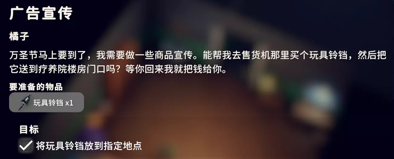 在自动售货机购买铃铛,然后到农场镇疗养院门口进行互动,即可完成任务。完成后将解锁蓝图:南瓜灯、杰克背包。
