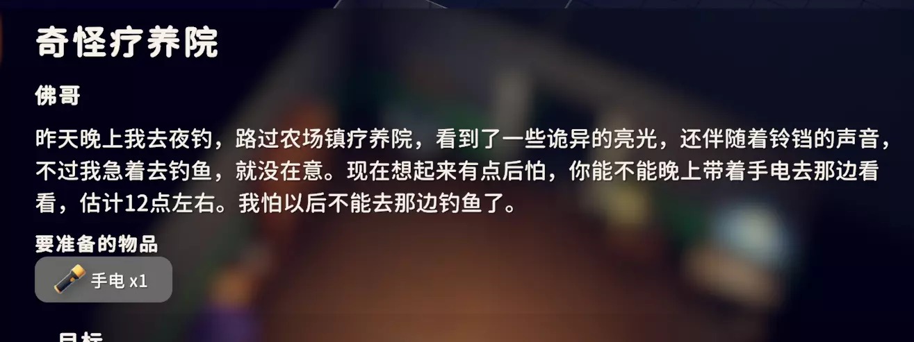 带着手电筒(护甲商橘子处购买,需橘子任务解锁),到疗养院正门互动,时间在晚上23:30-24:00之间。