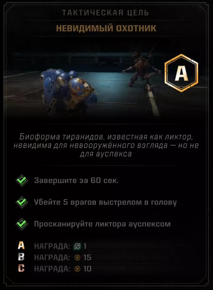 召唤一名支援星际战士,持续5分钟。支援星际战士的计时器在波次间隔期间不会倒计时。你可以在单次游戏会话中完成此试炼,大约需要30分钟,且需要1200点积分。