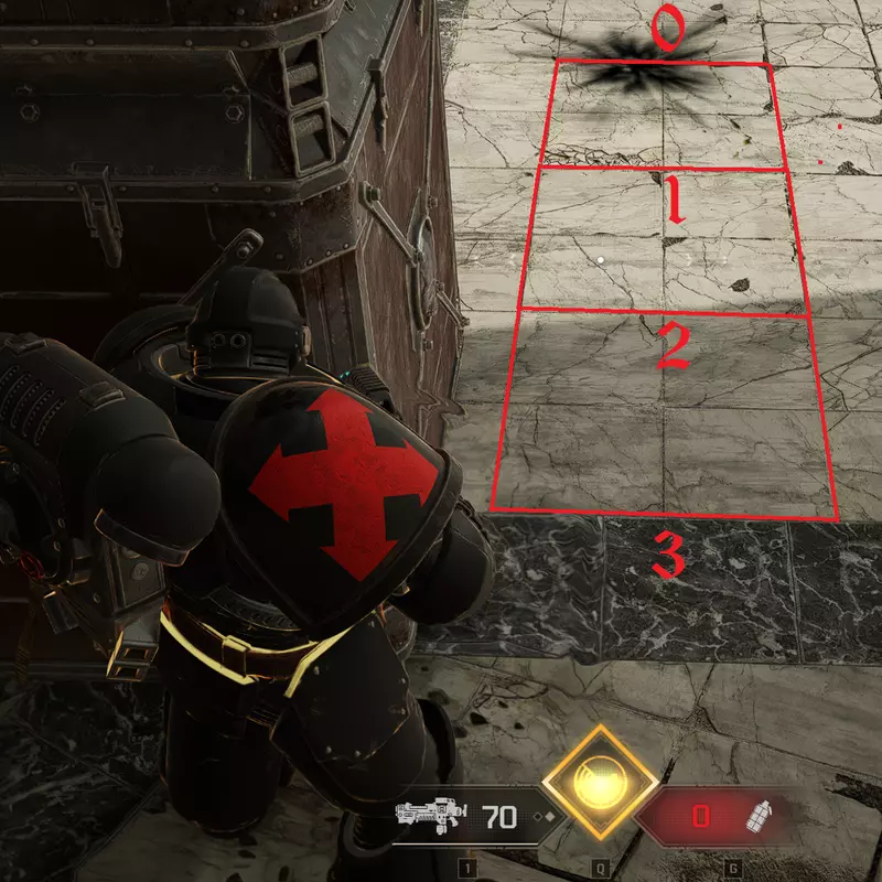 选择壁垒职业; 如果某个点位正在发生有大量敌人参与的战斗,就进入该点位; 使用壁垒职业时,有很大概率可以尽可能靠近并近距离投掷手榴弹; 地图:陵墓。场景8。该场景描述适用于星际战士阵营,但如果使用异端阵营,情况可能类似。