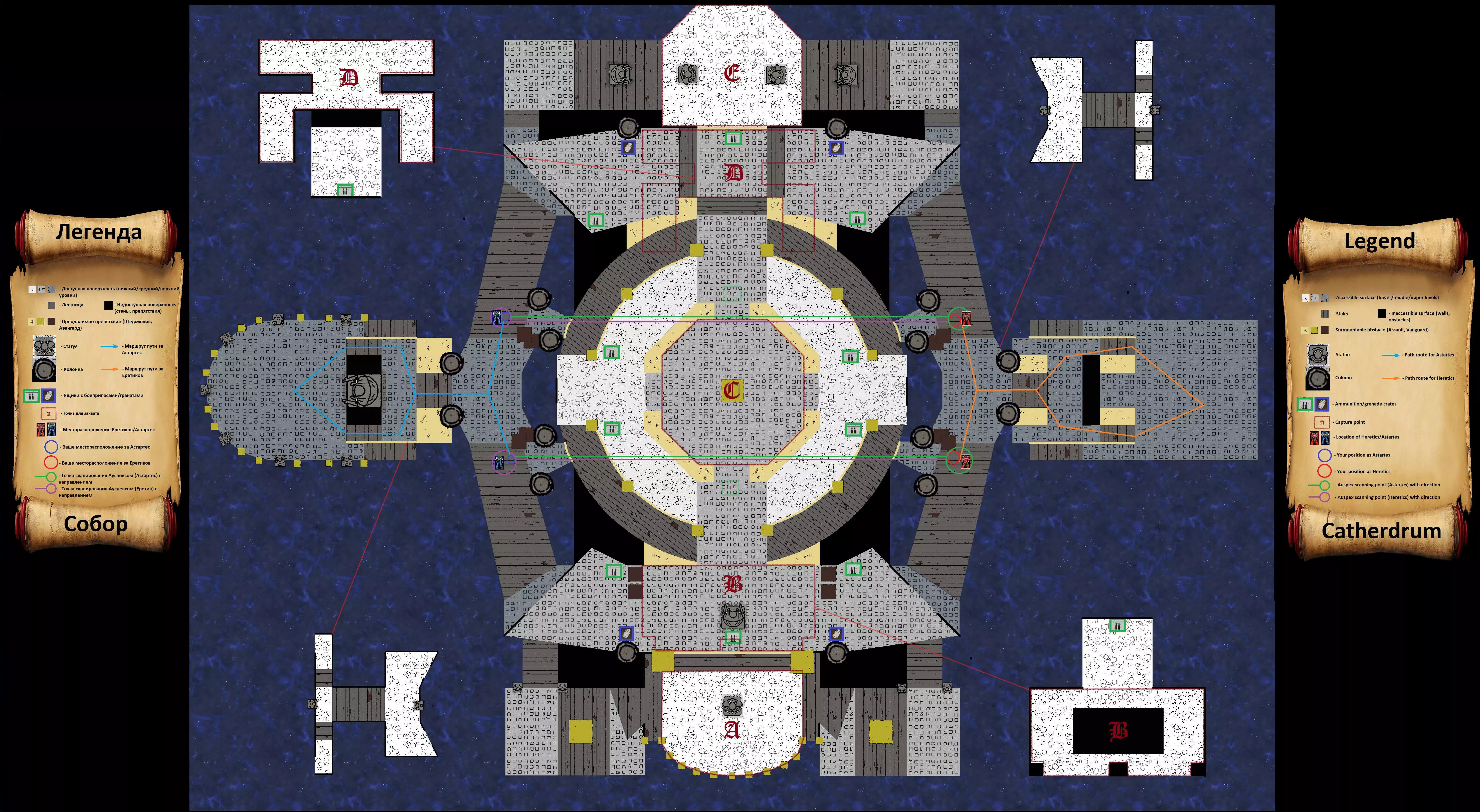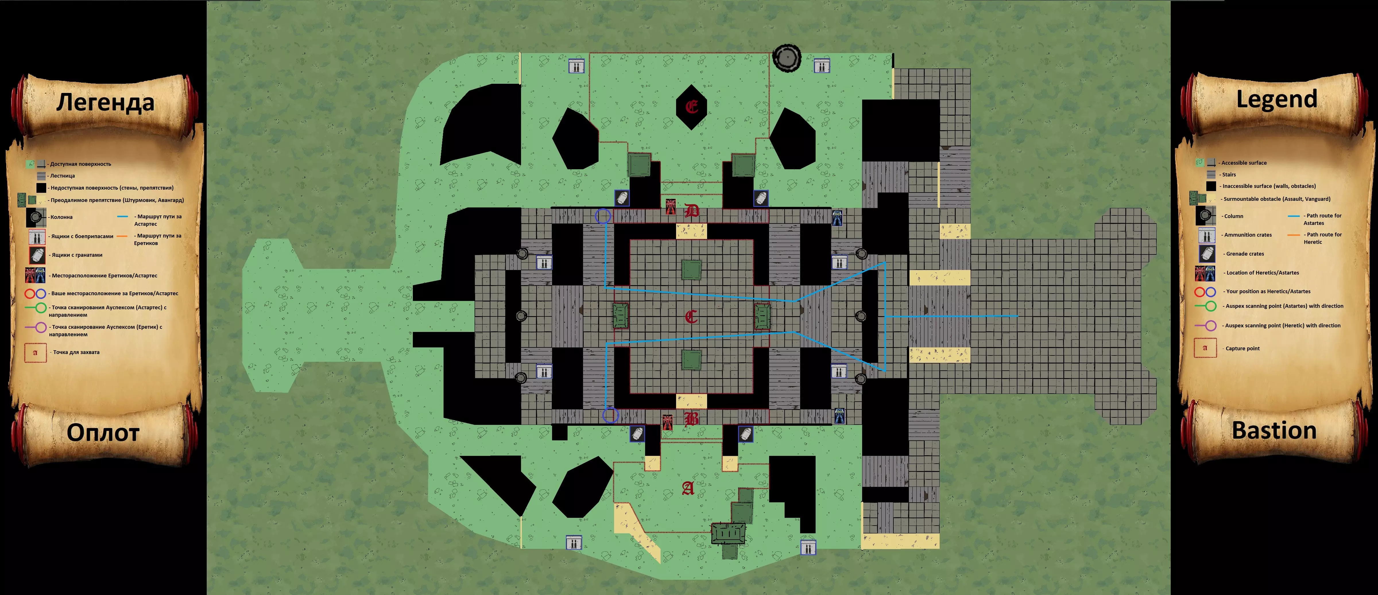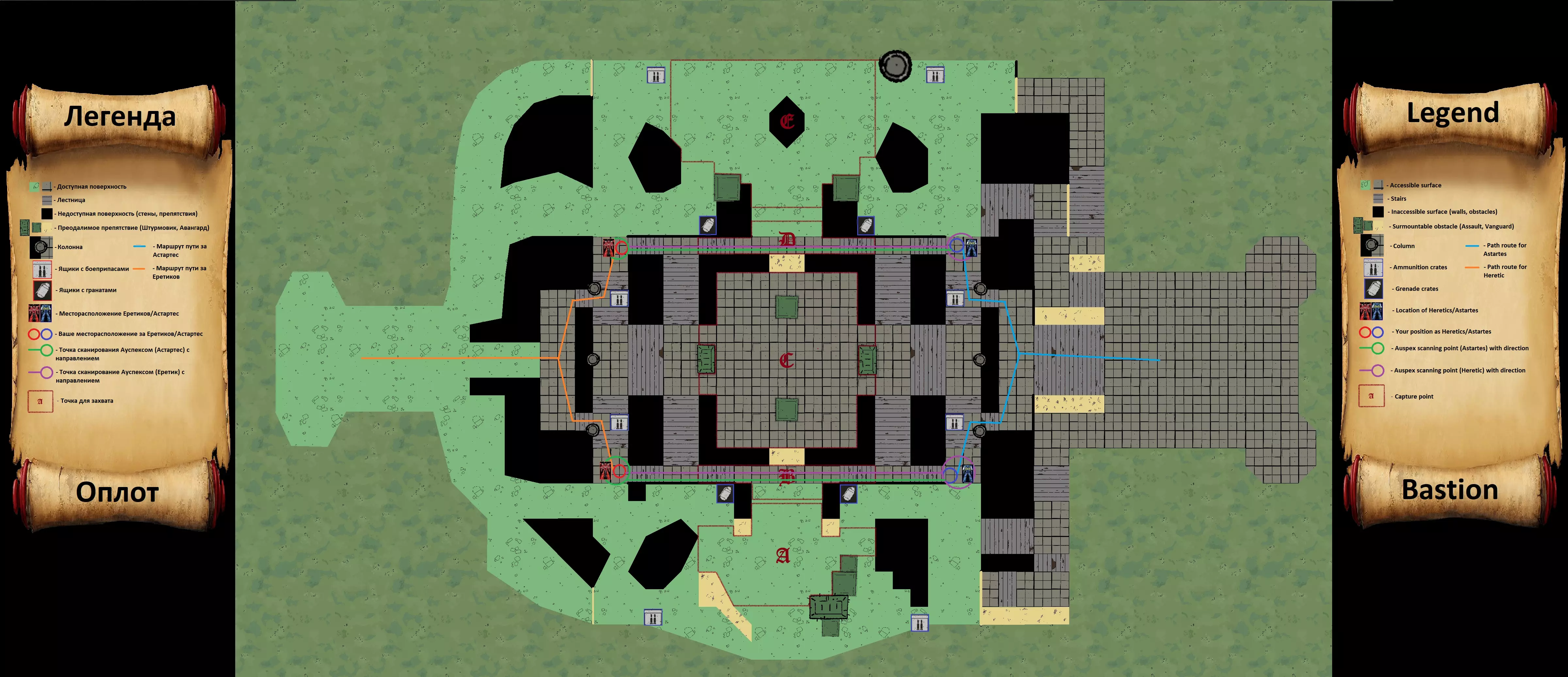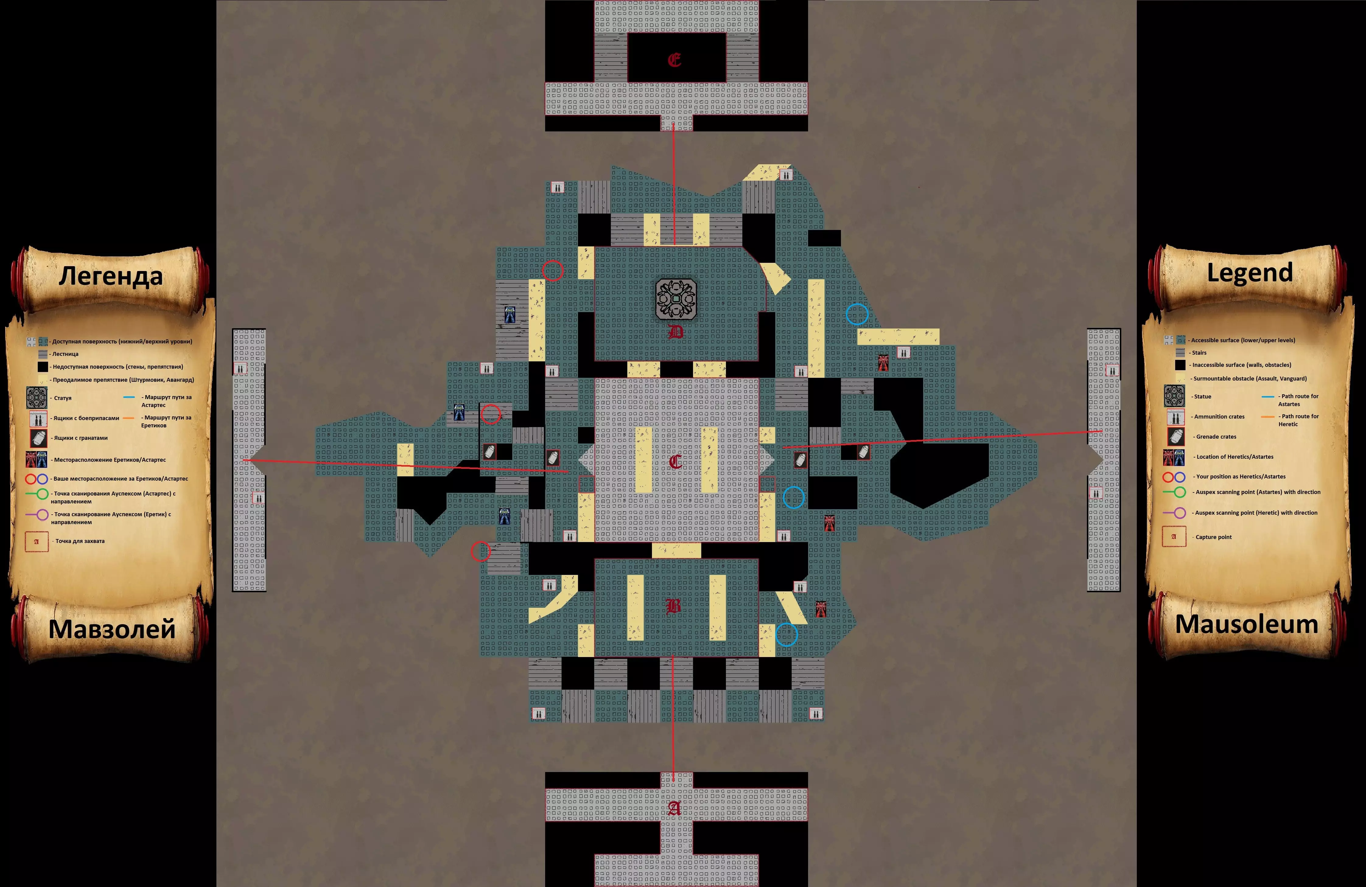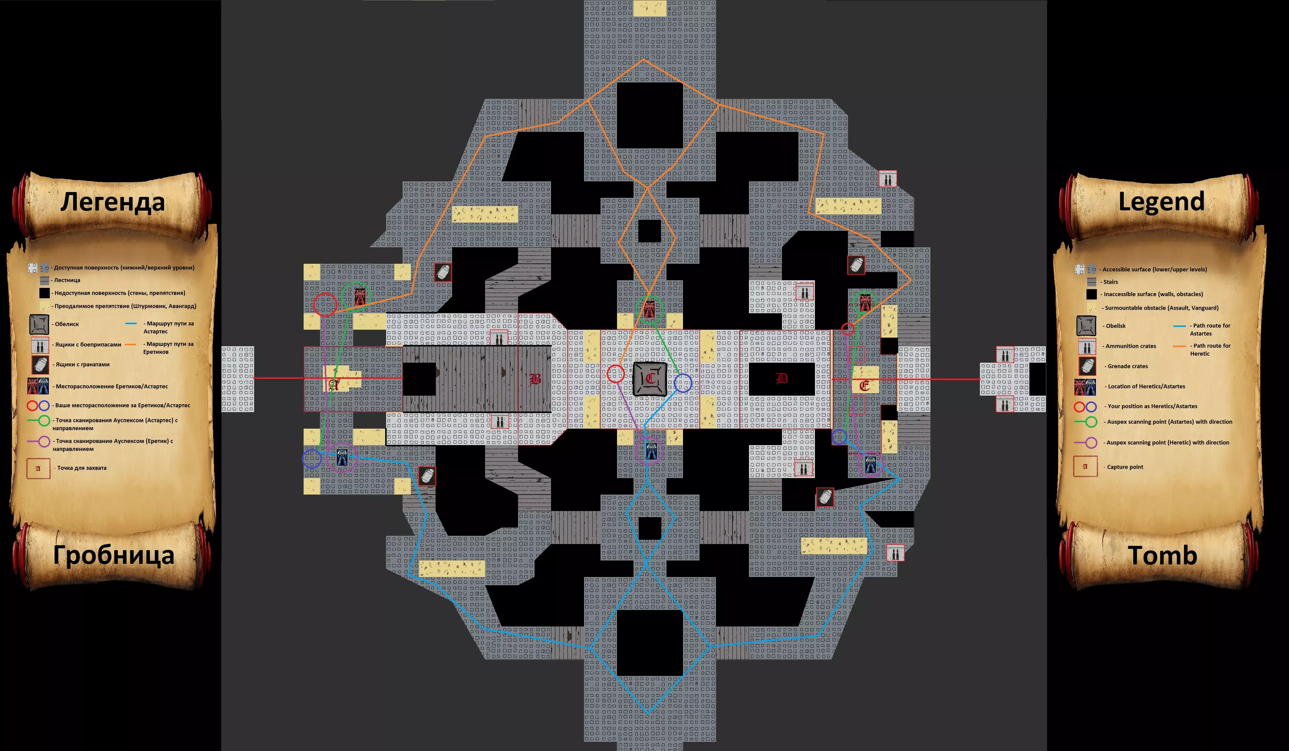 1. 选择士兵职业; 2. 比赛一开始就立即按照地图示意图上指示的路线奔跑; 3. 要选择正确的路线,需注意需要占领哪个点,此方案适用于B、D点; 4. 跑到示意图上指示的地点并激活洞察(Auspex); 在这个方案中,我成功完成了3次扫描。 对于陵墓地图,我未能在比赛开始时完成扫描。无法识别或无法翻译,直接返回原文:Вечная война часть 5