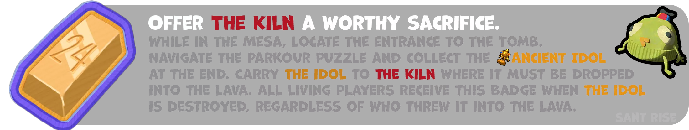 要获得此徽章,你需要获取任意一件神秘物品。你可以通过激活游戏每个关卡末尾的雕像来实现。(在多人游戏中,若有玩家死亡,激活雕像将复活死亡玩家,而非获取神秘物品)