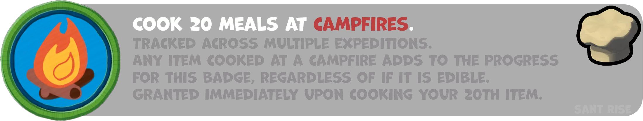 要获得此徽章,你需要准备20份任意食物。(游戏刚开始时,坠毁飞机的机翼上会有无限火源。你可以砸开椰子、寻找食物,并在那堆火上烹饪。)
