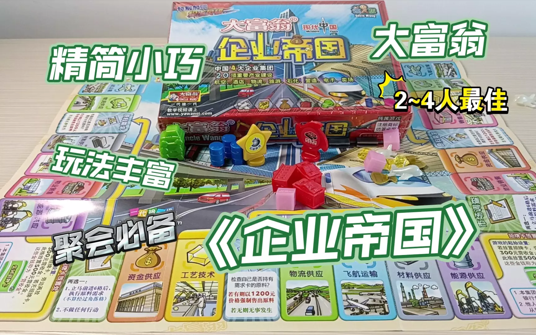 盒子小巧,但内容却极其丰富 可玩性很高,支持2到4人游玩,一局大概15分钟左右 突破了大富翁的传统玩法,可以说,算是亚湾大富翁系列巅峰之作