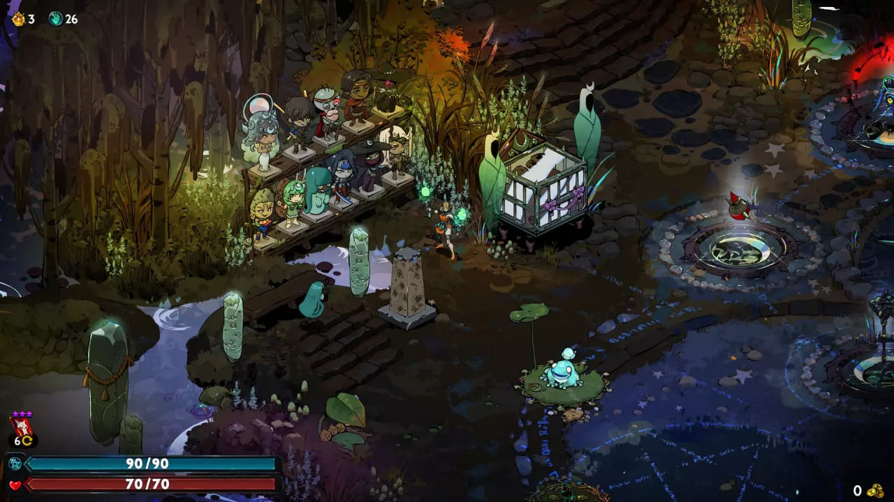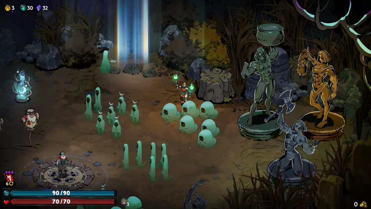 关键在于,第一个饰品我选了扎格雷(Zagreus)的,用来强化武器基础攻击的恩赐。打完第一个 Boss 后,我选了艾达(Aida)和珀尔塞福涅(Persephone)的恩赐,显然是为了获得某种艾达的恩赐以及恩赐强化效果。之后我选了厄科(Echo)的恩赐,因为可选的余地确实不多了,但总体上还是要根据实际情况来决定。 打克洛诺斯(Chronos)之前,我选了斯凯莱梅亚(Skelmeya)的恩赐,这样就能 100% 通过,不用太费劲。补充说明一下,如果你们要获取这些数据包,那么克洛诺斯冲刺会非常快,所以请务必小心。 将鼠标悬停时,你会看到所有的帷幕雕像。