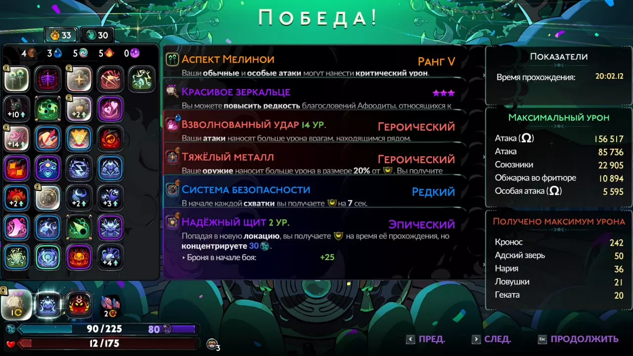 Советы для Защитницы Ночи Геката с пактом - 7/10 по сложности, ничего мега сложного, но с 32 черепами может доставить трудностей, на экране часто много снарядов, у вас на этот момент какой-то конкретной сборки либо урона может не быть, так как это только начало, поэтому она может быть тем самым боссом, который сведёт ваш забег на нет. Чисто моя рекомендация если вы играете без ограничения по времени - не торопится с ней, чтоб не поймать большое количество снарядов, Геката сама бежит к игроку, поэтому можно отталкиваться от дистанции. Циклоп с пактом - 6-9/10 в зависимости от вашего оружия, вот я просто терпеть не могу парные клинки и топор, так как есть условные факела, где вы стреляете и летите, как на сузуки, а есть топор, где вы просто на уазике катитесь, лично как для меня тут выбор оружия больше играет роль. Про самого босса я в руководстве уже писал Сирены с пактом - 9/10 по понятным причинам, пройти их не потеряв отпор смерти дело опыта и вашего билда, но даже при всех составляющих могут доставить не мало трудностей. Лично я не выбираю какую-то приоритетную цель, зачастую я стараюсь убрать щупальца Харибды, так как они занимают большое количество пространства, стесняют ваши перемещения, после чего стараюсь убрать барабанщика, но нужно учитывать, что во время боя обстоятельства могут быстро меняться, но мой приоритет целей таков. Эрида с пактом - 5/10 никогда не испытывал с ней трудностей от слова совсем, так как она достаточно предсказуемая, самое сложное это шары, которые она оставляет при переходе из фазы в фазу, но это не то же самое, что без пакта, когда она могла за одну очередь из оружия тебе снять отпор смерти, если ты ошибся, сейчас такого нет. Цербер с пактом - 6/10, единственное, что было для меня сложным - его атака, когда он начинает стрелять огненными шарами по всей арене, эта атака действительно может доставить трудностей, а так же самое начало боя, так как вы скованы в своих перемещениях и вам необходимо как можно быстрее перевести Цербера во 2 фазу, чтоб расширить арену и иметь возможность хоть как-то маневрировать по полю боя. Братки с пактом - 6/10 так же никогда не испытывал с ними трудностей, достаточно один раз с ними подраться, чтоб вообще от них больше не терпеть, так как по сути самое сложное это момент, когда Прометей вылетает с арены и начинает линии огня применять, а в это же время Геракл на вас со своей дубиной летит, вот это может быть проблематично, но учитывая, что игрок на этот момент уже победил Прометея пару раз точно, то он уже понимает, что эта атака Титана не такая уж и сложная и контролировать Геракла и огонь он сумеет. Так же из-за того, что их двое дары Геры хорошо работают и вообще всё, что наносит урон по области. Кронос с пактом - 8/10 как для меня, возможно то, что я собрал было просто невероятно сильно, либо я просто не ставил достаточное количество черепов для ещё большего его усиления, так как я просто поставил минимальные 12 и прошёл его с первой попытки, Тифон, как по мне, сильно лучше сделан. Конкретно то, что добавляется делает его сильнее, очевидно, первая фаза сильно не поменялась, просто немного усилили его обычные атаки, вторая фаза сильно тяжелее, чем новая третья, в третьей, как будто, вообще можно урон не получить, в то время как во второй ему постоянно восстанавливают здоровье, в общем сильно тяжелее, чем обычная втора