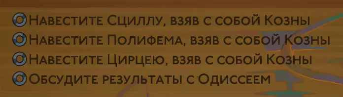 未竟之事 完成预言“未竟之事” 需要尽可能与奥德修斯、喀耳刻建立完整的友好关系,完成预言“带着山羊去见波吕斐摩斯”,还要与喀耳刻交谈,她会想起奥德修斯,斯库拉和波吕斐摩斯也应如此,之后奥德修斯会陷入抑郁,与他进行几段对话后将出现此预言。