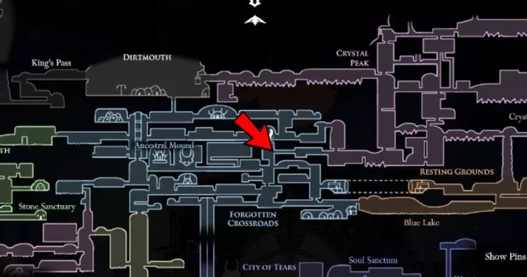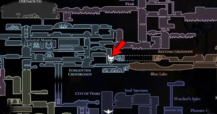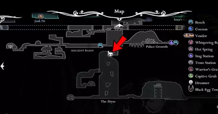 要提升你的《空洞骑士》技能,你需要再次与大黄蜂战斗并存活下来。击败她(再次击败后),你将到达废弃外壳,在那里可以获得国王印记。现在前往古老盆地的这个位置: