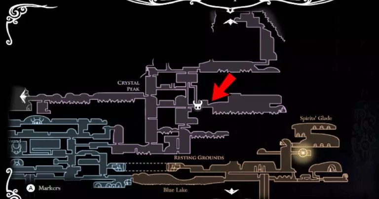 收集900个精华后,返回先知处。她会赋予你另一项能力——梦境之门,这其实就是《空洞骑士》中的一种快速旅行方式。你几乎可以在圣巢的任何位置使用梦境之门,直接传送到那里,非常实用。 暗影披风 到目前为止,你可能已经注意到一些带有暗能量的奇特墙壁,它们被称为暗影之门,你无法穿过。要最终进入这些门,你需要获得暗影披风,它可以看作是飞蛾披风的升级版。 首先,你需要找到国王印记。它位于王国边缘,具体位置如下: