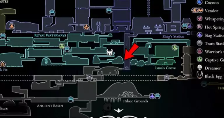 当你抵达古老盆地后,前往该区域并与残破容器战斗。这个 Boss 看起来很像生病的你自己。他会进行劈砍攻击、频繁移动,并投掷带有感染性的橙色斑点。 击败他后,前往下一个可探索区域,你将在那里找到 monarch wings(帝王之翼)。现在你终于可以进行二段跳了。 伊斯玛的眼泪 你可能已经在苍绿之径、真菌荒地或圣巢的其他区域掉进过酸液里。我们知道这非常令人恼火,但有一种方法可以让你毫发无伤地穿过酸液。 要获得伊斯玛的眼泪,你首先需要进入皇家水道。穿过这个区域,直到你到达与粪虫防御者的战斗。击败他后,按下右侧的拉杆。然后前往地图的这个区域:
