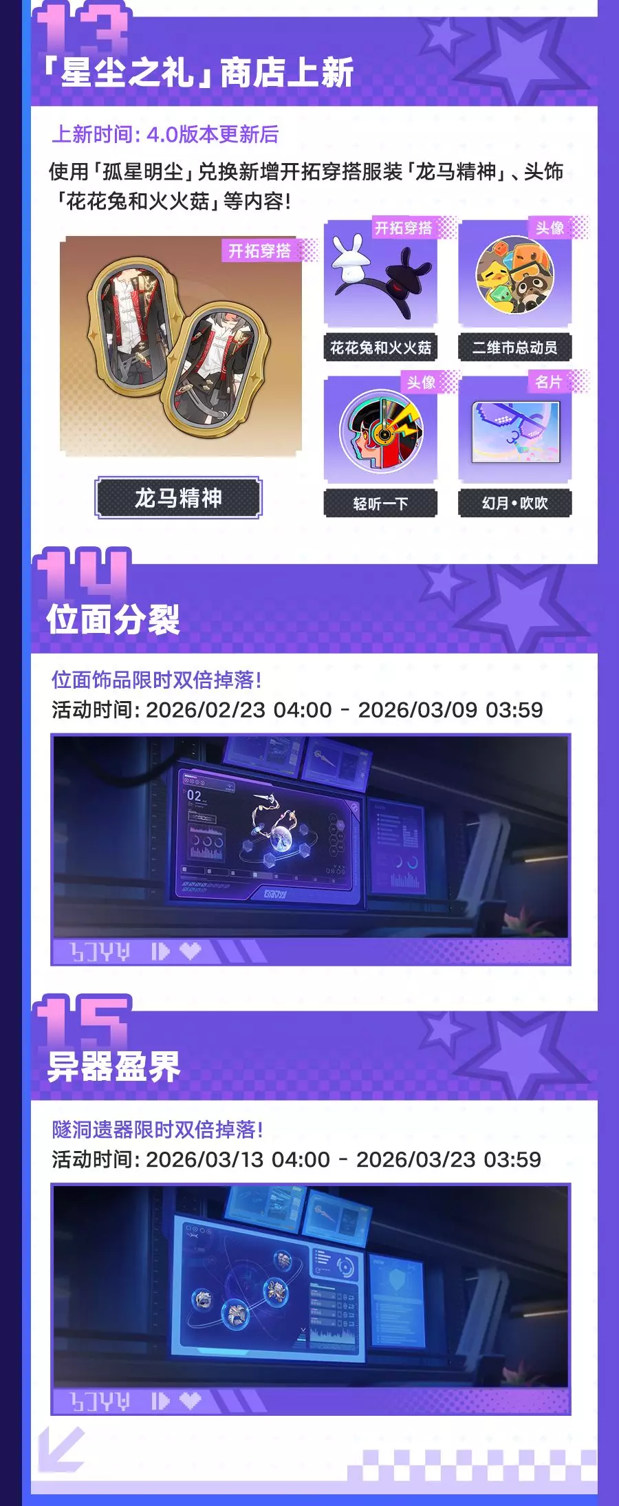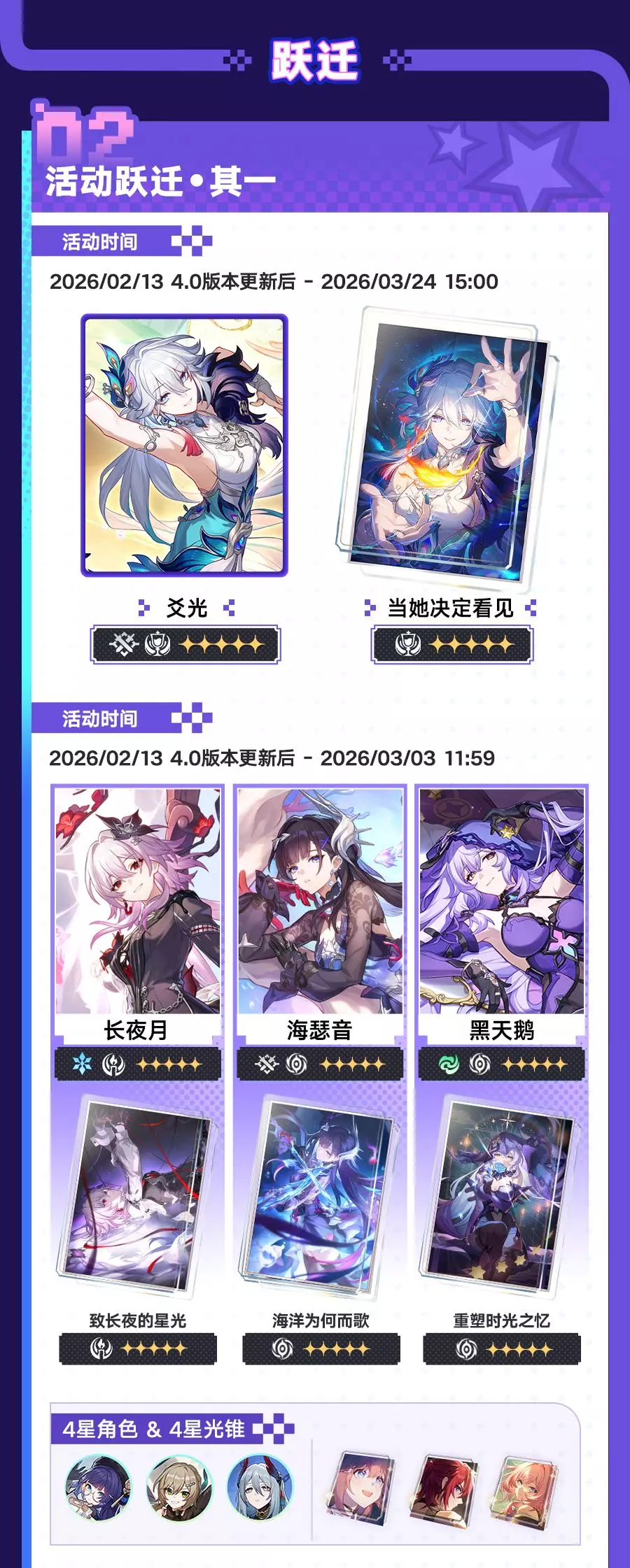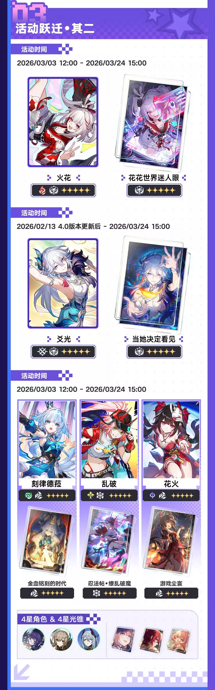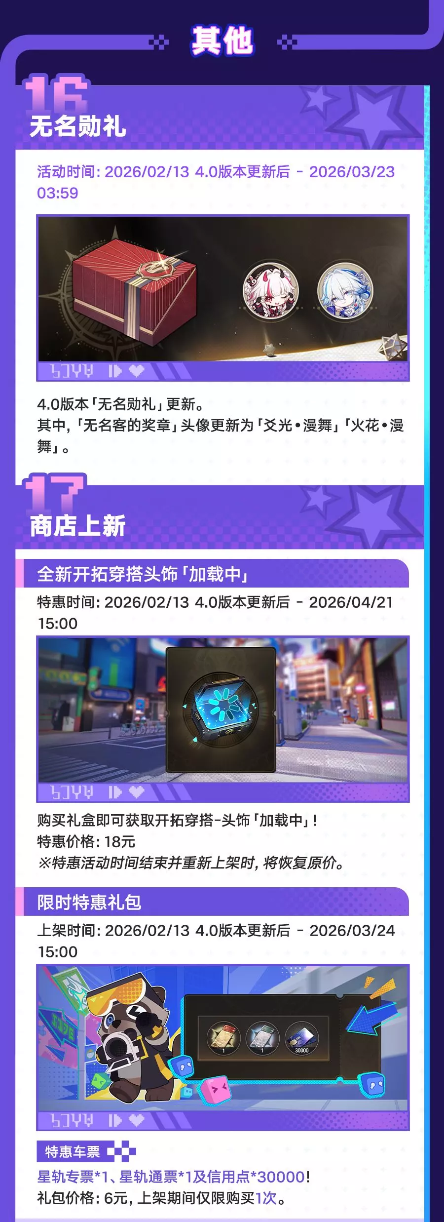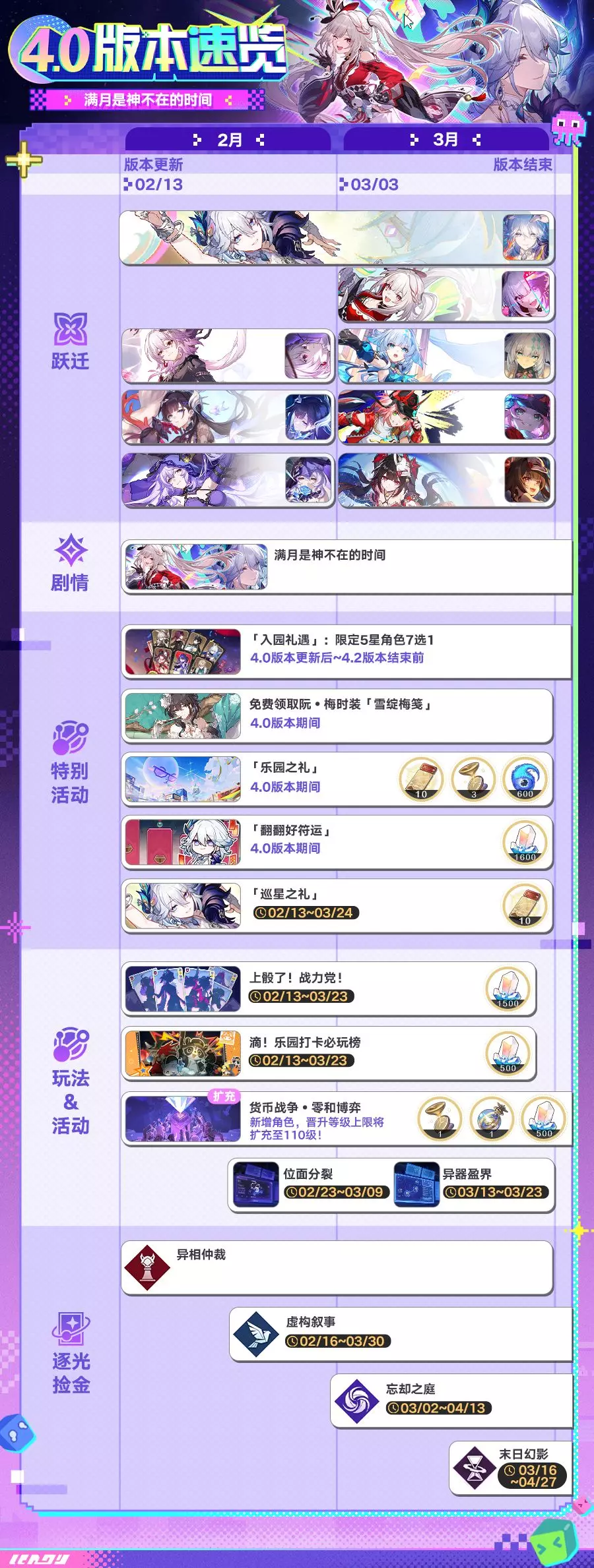 《崩坏:星穹铁道》4.0版本「满月是神不在的时间」2月13日更新,3月3日结束。版本开放全新开拓任务,上线爻光、火花等新角色跃迁卡池,还有入园礼遇、乐园之礼等多重福利,以及「上骰了!战力党!」等玩法活动,同时更新商店内容与相关礼包。