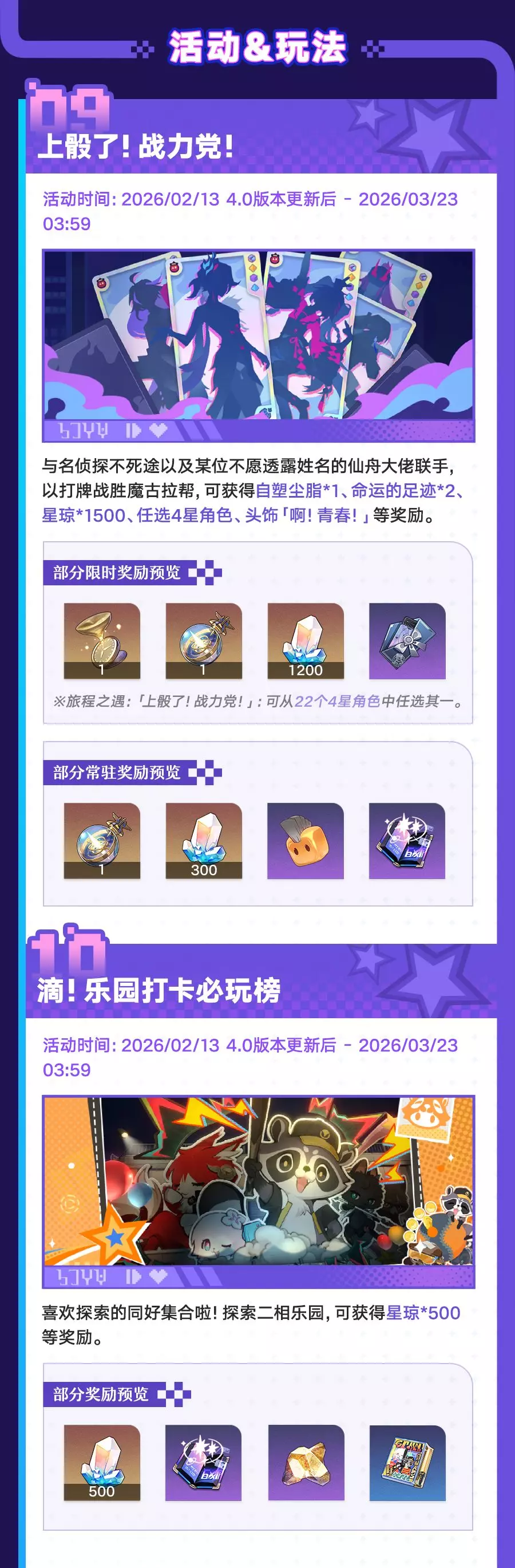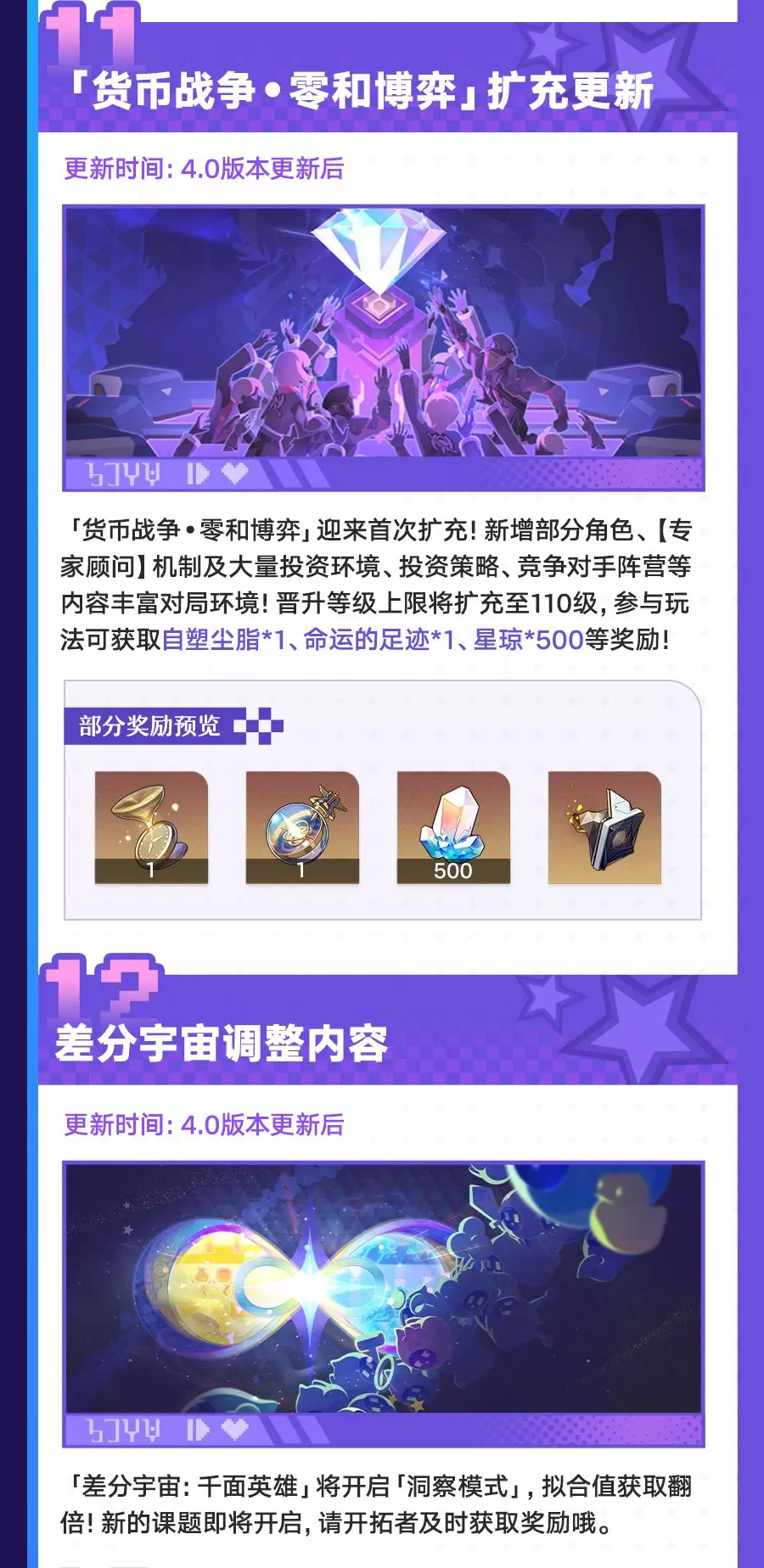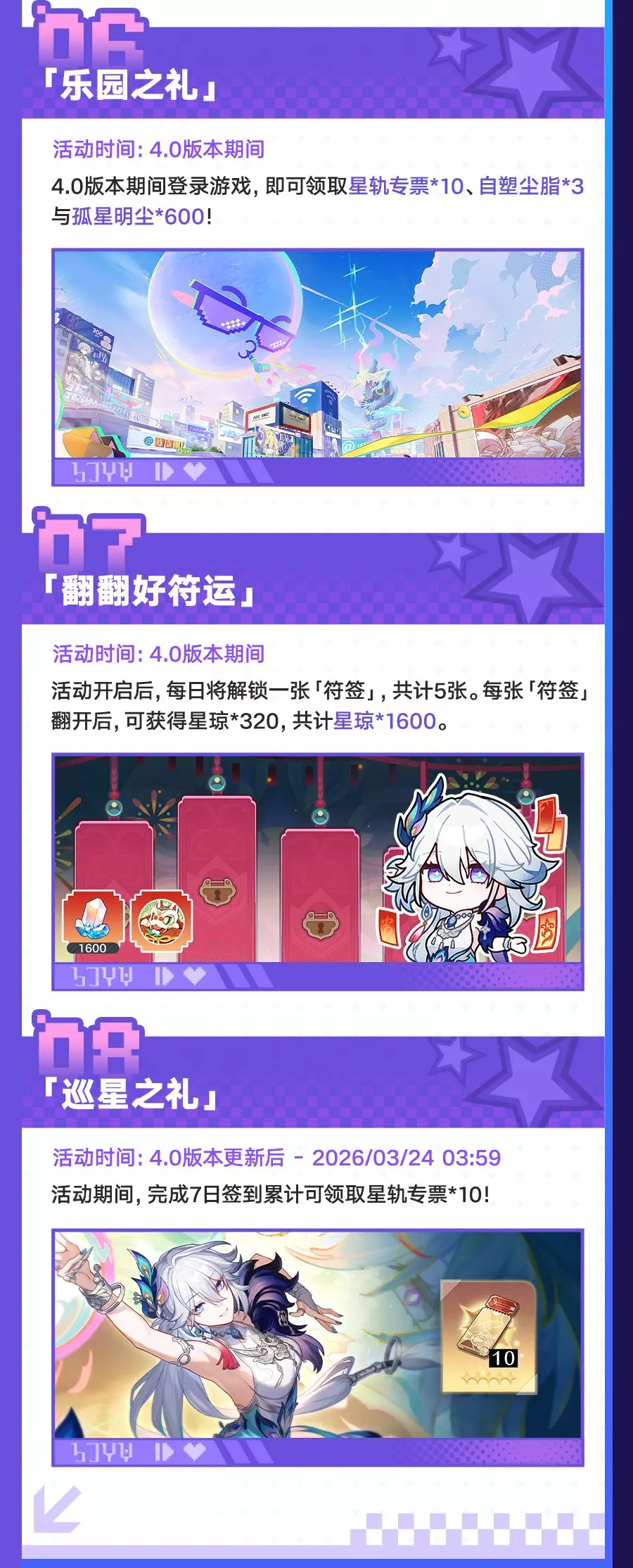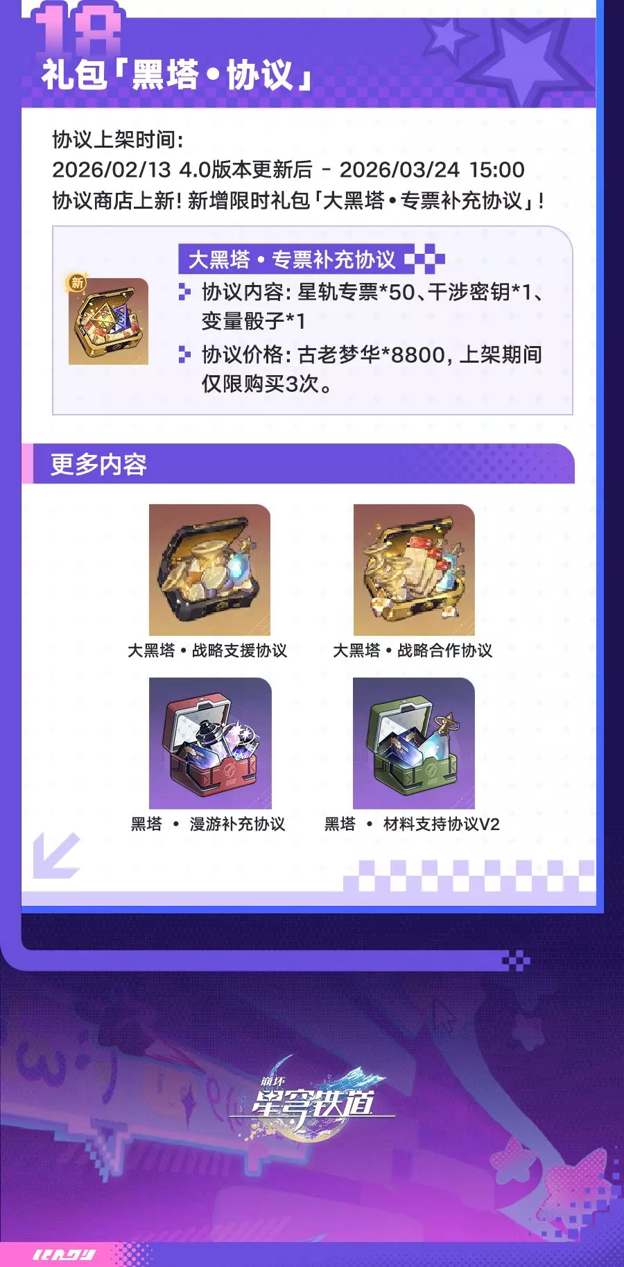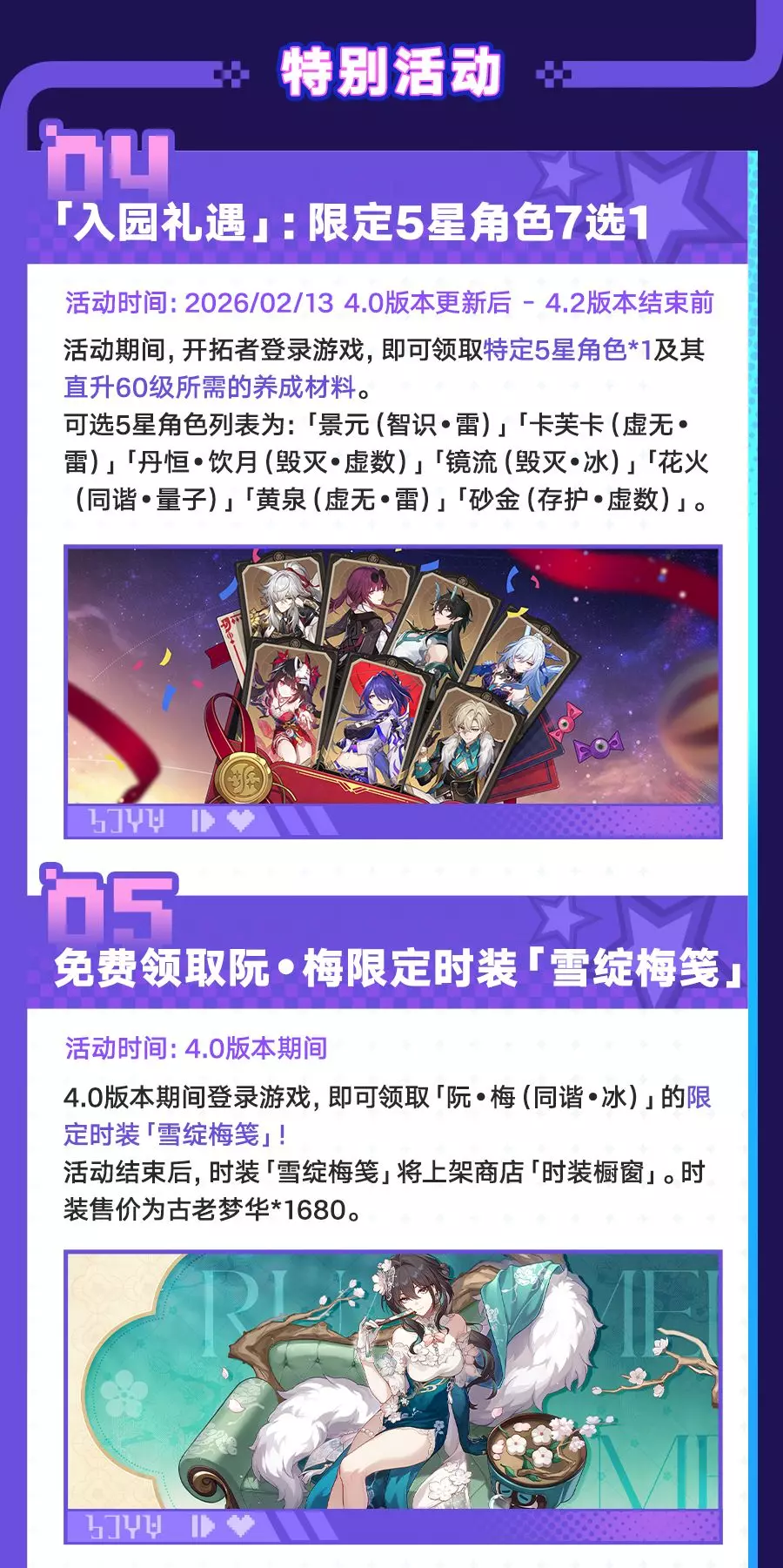 《崩坏:星穹铁道》4.0版本「满月是神不在的时间」2月13日更新,3月3日结束。版本开放全新开拓任务,上线爻光、火花等新角色跃迁卡池,还有入园礼遇、乐园之礼等多重福利,以及「上骰了!战力党!」等玩法活动,同时更新商店内容与相关礼包。