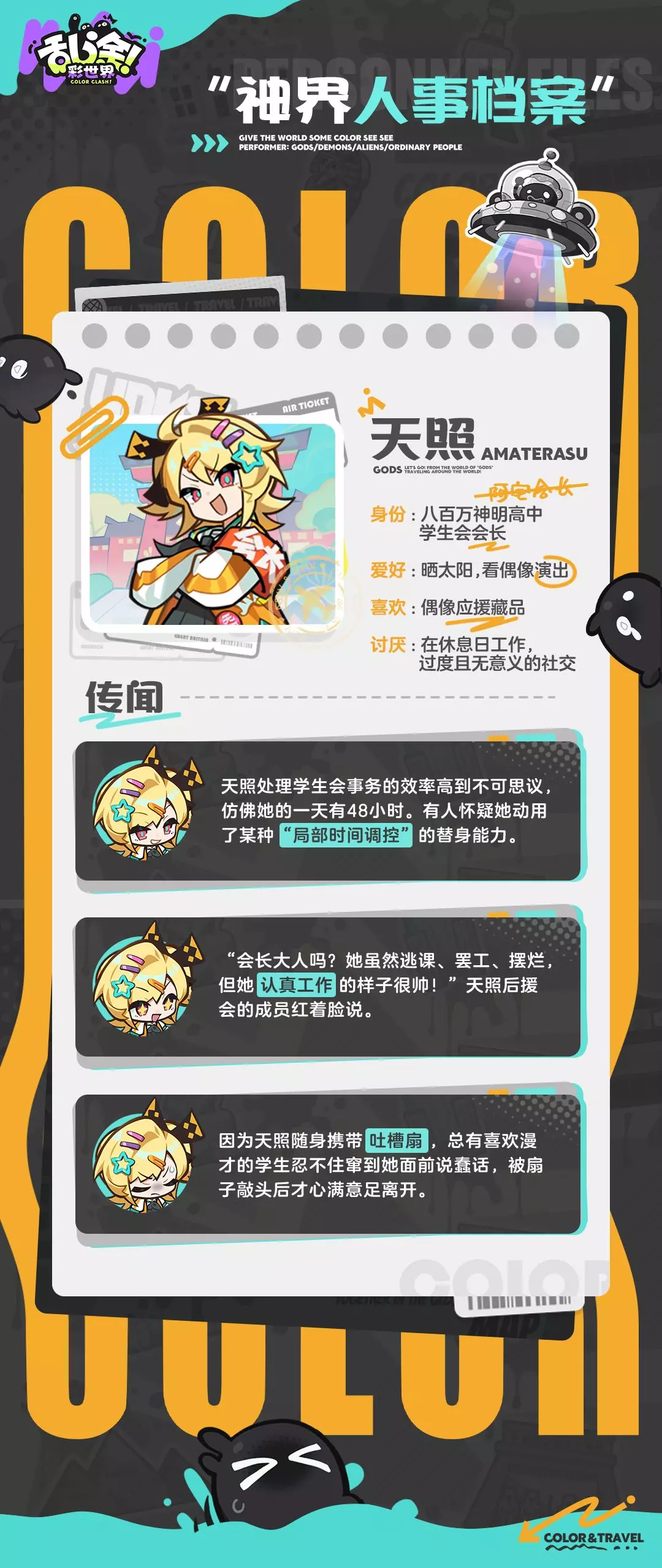 本文是《乱涂!彩世界》里的神界人事档案,介绍了八百万神明高中学生会会长天照:她对外是完美现充,私下是偶像宅,在意外表,还拥有拔刀斩、千本刃等技能,处理事务效率极高。