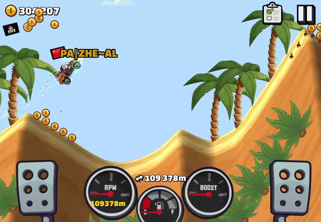 玩家分享《登山赛车2》的游戏成果,参考教程操作,使用登斯拉赛车在狂欢钻头关卡跑出10978米的成绩,成功突破万米,展示了游戏中的赛车行驶、收集金币等画面。