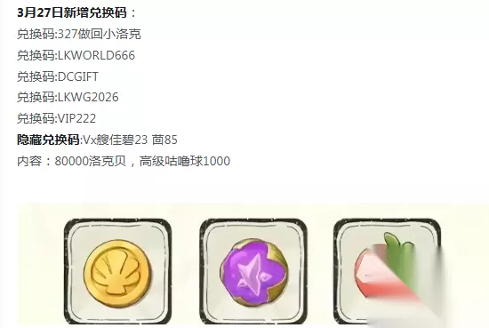 《洛克王国:世界》最新下载预约地址 高速下载 普通下载 优先233乐园APP下载 现同步公布2026年3月27日全网有效的新版礼包码,适用于安卓及iOS双端,所有代码均可在游戏内直接兑换,无设备限制、无账号绑定要求。 兑换码:327做回小洛克 兑换码:LKWORLD666 兑换码:DCGIFT 兑换码:LKWG2026 兑换码:VIP222 隐藏兑换码:Vx艘佳碧23 茴85 成功使用全部礼包码后,玩家总计可领取80000洛克币与1000枚高级咕噜球。兑换路径统一:进入游戏主界面→点击右上角头像图标→选择“兑换中心”→输入对应口令并提交→奖励即时发放至邮箱。该批资源对新手期至关重要,能显著缩短前期资源积累周期,降低开荒门槛。