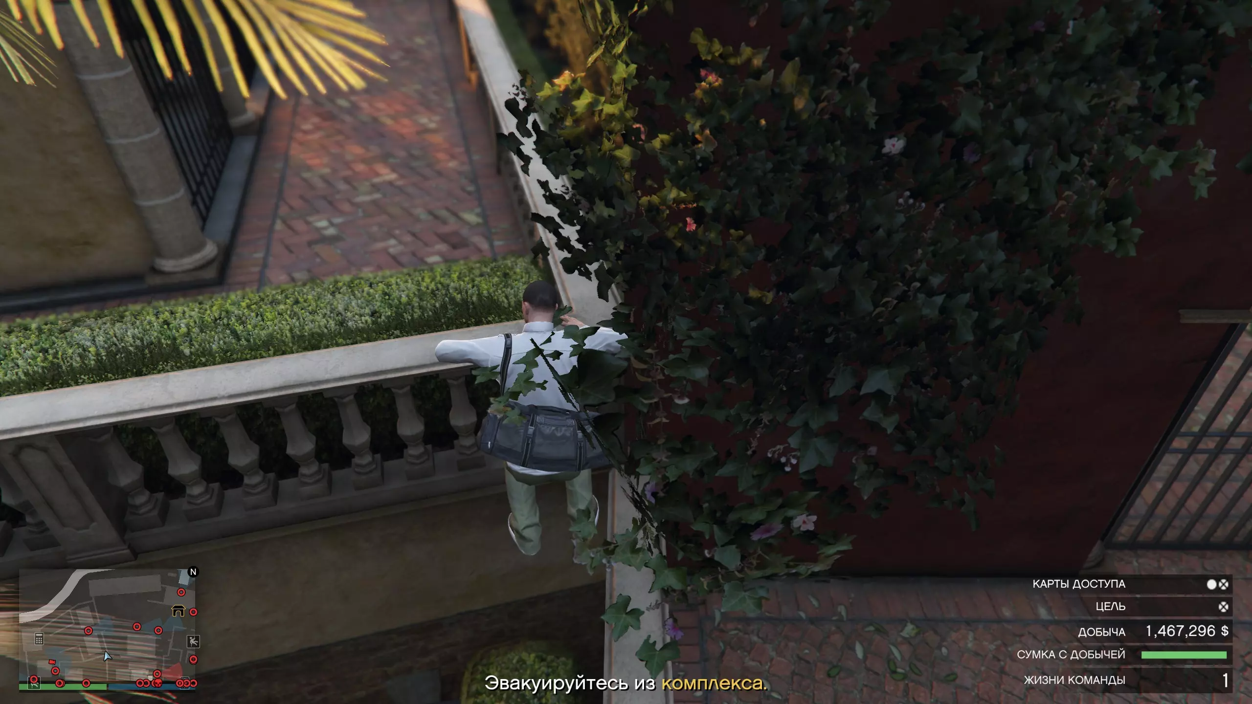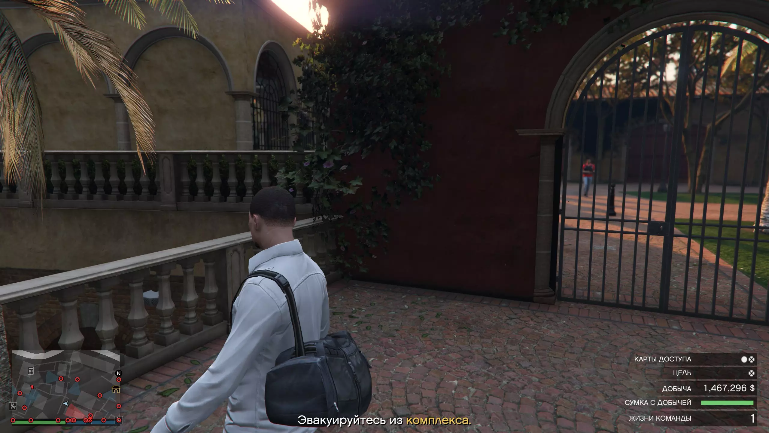 好了,我们拿到了主要目标,离开了办公室,沿着楼梯下到第一个被击倒的警卫那里。现在我们需要翻过大门旁边的栏杆。