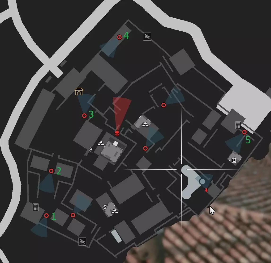 指纹复制器 在第一个点位可以无视摄像头直接进入。 立即躲到右侧的货架后面,然后向两盏灯之间的位置投掷手榴弹。