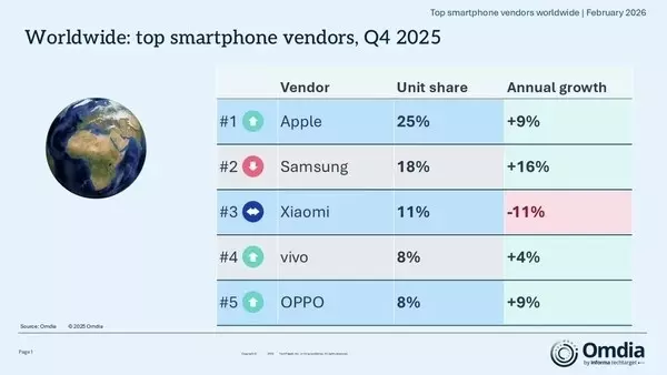 2月12日,数据机构根据Omdia最新发布的2025年第四季度全球智能手机市场数据,全球智能手机市场在该季度同比增长4%,主要得益于季节性需求回升及库存管理的改善。 尽管部分厂商面临零部件成本上升的压力,但头部厂商依然主导了增长,苹果与三星继续领跑全球市场。