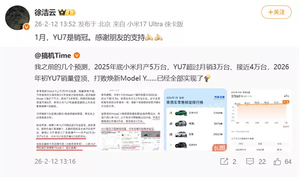 快科技2月12日消息,今天,小米集团董事长特别助理、战略市场部副总经理徐洁云引用汽车之家等平台数据发文表示:“1月,YU7是销冠。感谢朋友的支持。” 据汽车之家发布的2026年1月全国乘用车零售销量排行榜显示,小米YU7以37869辆的成绩登顶榜首,成为当月国内乘用车零售销量冠军。