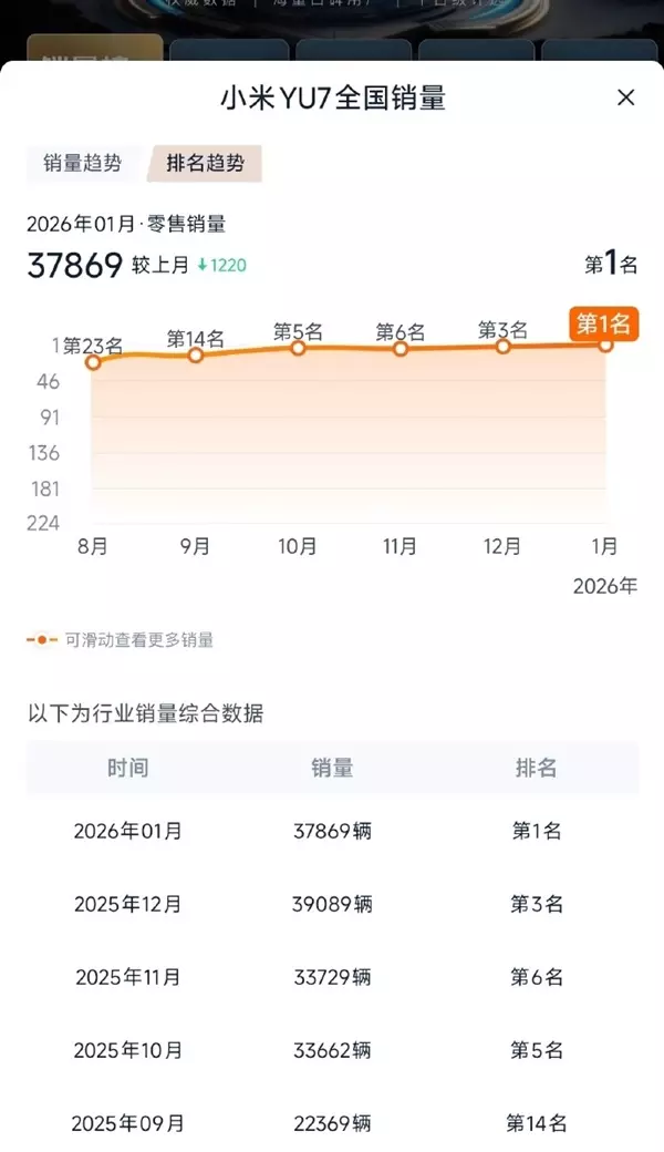 自2025年8月至2026年1月,小米YU7的市场销量排名呈现出持续攀升的态势:2025年8月位列第23位,9月上升至第14位,10月、11月分别位居第5位和第6位。 12月进一步提升至第3位,并于2026年1月成功登顶销量榜首。 从销量绝对值来看,小米YU7的市场表现同样突出:202510月、11月分别达到33662辆、33729辆,12月销量攀升至39089辆。 2026年1月销量为37869辆,虽环比小幅下降1220辆,但仍以该成绩位居全国销量第一。