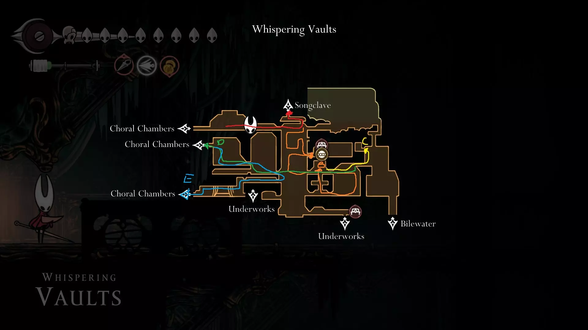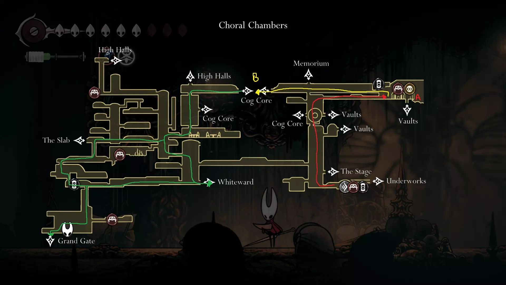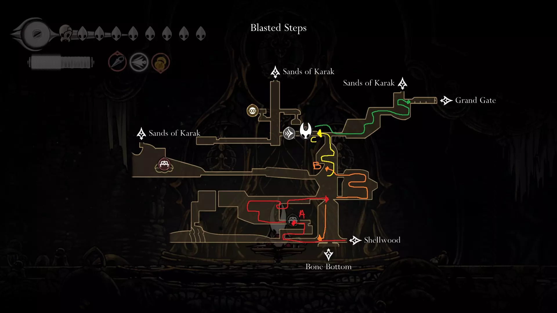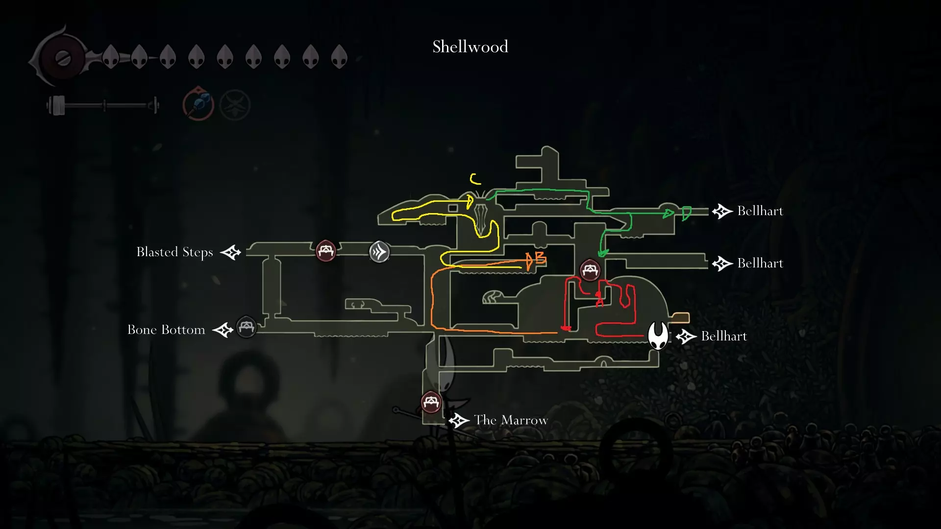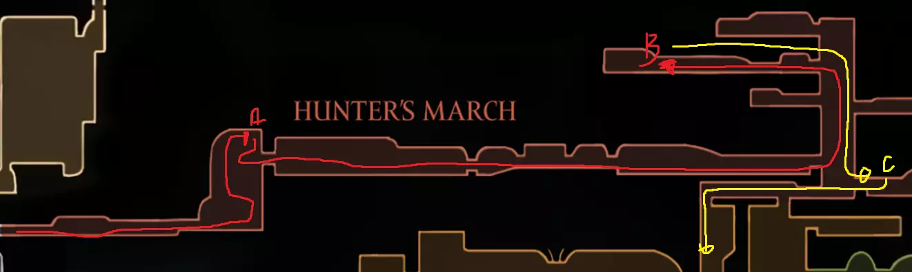 4 things to do here; Start off going and opening the Song Clave shortcut. Thats your first step. Go down and proceed to get your Mask Shard at B.( finally another HP ) Once you get that, go follow the yellow route and get your free Memory Locket at C. Go down and go get your Pale Oil. You should be able to avoid all the mobster in the area. Lastly come out and follow the blue route to open Trobbio at E and then return to the train station to bench. Whats next? At this point now, you should be aiming for 7 things: Double Jump Drones Architect Crest Plasmium Phial Get More HP Get more Memory Locket Get more Spool Fragment Tool Pouch Upgrade I am not going to dictate where to go or what to do atm because its a huge work to upload and do but I will generally give some advice here. Mount Fay Cold Freeze can be negated with Flint Slate for a few seconds if you need the time. You need the simple key to open it so getting it from Pebb or Jubilana would work here. The other 2 keys are at Sands of Karak / Sinner Road so unless you have higher HP, dont bothered with the risk Drones are nice to have as it opens up more safety ( replacing your Red Tool ). You never take them off anyway so yea. Architect Crest needs 25 tools to be allowed for purchase and from what we have so far, we have, we should have: Warding Bell, Druid Eyes, Magma Bell, Straight Pins, Shard Pendant, Flea Brew, Injector Band, Compass as definite tools. What you could collect as quite safe are as follows: Magnetic Brooch, Snare Setter, Shell Satchel, Long Pin, if you bought the craftmetal from Pebb, Stingshard is available, Flintslate, Weighted Belt, Barbed Wire, Tacks, 3 Fold Pins, Drones, Plasmium Phial, Magnetite Dice, Ascension Grip, Silkspeed Anklets, Memory Crystal, Pollip Pouch, VoltVessel, 2 vendors items: Multibinder / Spool Extender. Plasmium Phial is straight forward, just collect 3 flowers. You can heal from the falling enemies that go pass by and collect 1 memory locket there. If you can also, you can collect the other silk skill but if you dont want, its fine~ you can visit Alchemist guy later in Act 3 and get that skill there if you feel stronger or when you start collecting fleas. Memory Locket, what you are missing atm: One in Bone Marrow where you got the flea, the bar in Greymoor, Bellhart Vendor, Blasted Steps, The Slab, Memorium, Underworks. Those are the safe ones. The more dangerous ones are Wormways, 2 at Bilewater, Sands of Karak, Deep Docks. The last 2 will only be obtainable in Act 3, Bellheart Top and Karmelita. Spool Fragment: You can look it up. Generally all of them are relatively safe except probably the Deep Docks one. Tool Pouch Upgrade is very simple to get. Damage Upgrades are from 12th Architect / Crawbuy Quest ( the Greymoor bar to kill x craws for the scarecrow ) / Grindle / Forge Daughter. The Capacity is from Nuu / Pilgrim Rest / Loddie ( the straight nail challenge ) and finally Flea to Fleatopia ( which is whatever ). Lastly, Mask Shards. You want to get the mask shards from this order: Mt Fay > Blasted Steps > Deep Docks > Wisp Ticket ( this being last cause its at the end of the Wisp Ticket so it would refill your HP to full ) Savage BeastFly Quest ( means you have to go through Hunter March and kill off the first Savage Beastfly. If you have drones here, it would help here, the next quest and the next mask ), Far Fields Lava Segment ( Drones + Pouch Upgrade both Damage and Capacity and full HP will help here since the lava stops when you recovered ), Putrified Ducts to get key to The Slab and lastly Bilewater because f*cking random fish doing 2 HP damage is crazy and getting that last means you can refill your HP. The worst part about this is that I would advice you to avoid the last 4, as it is the most dangerous and can kill the run. HOWEVER mask shards account for 100% sooooooooooo : ( . If you want, you can skip these 4 until you finish GMS and then collect those after. IF ANY SPOOL FRAGMENTS OR MEMORY LOCKET OR OTHER STUFFS ARE DANGEROUS, JUST AVOID IT UNTIL FINISHING GMS SO THAT AT LEAST YOU GET THE ACHIEVEMENT FOR STEEL SOUL. YOUR PRIORITY IS 8 MASK HP AND EVERYTHING ELSE LATER IS SECONDARY. DONT LOSE A RUN BECAUSE YOU HAVE TO DO AN ARENA THAT YOU WERENT PREPARE Below are some small video tips