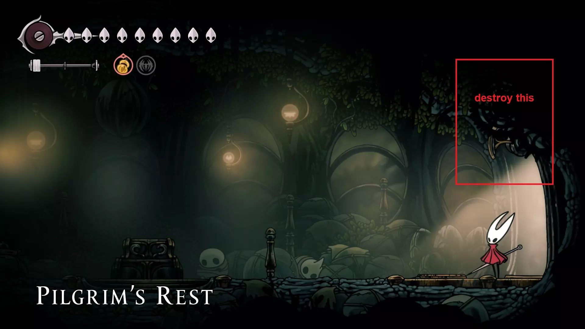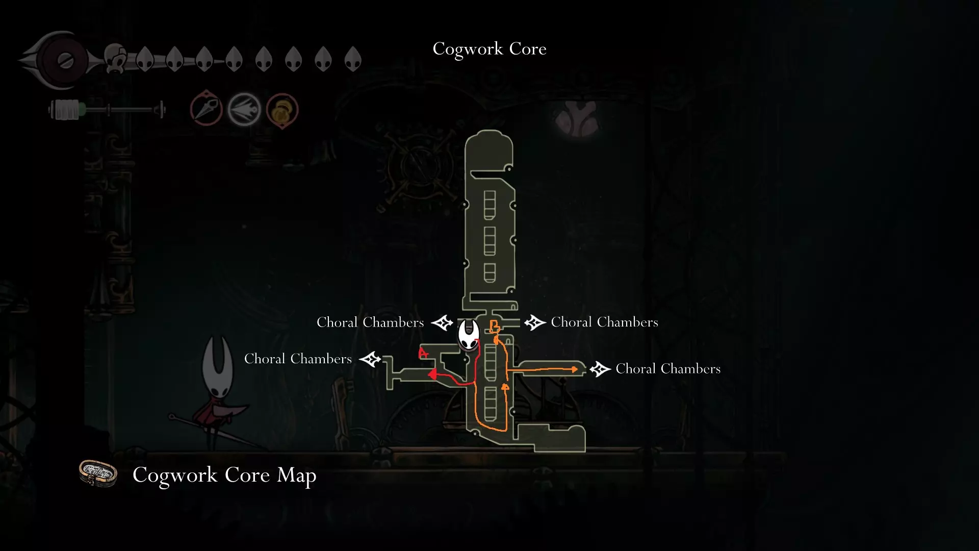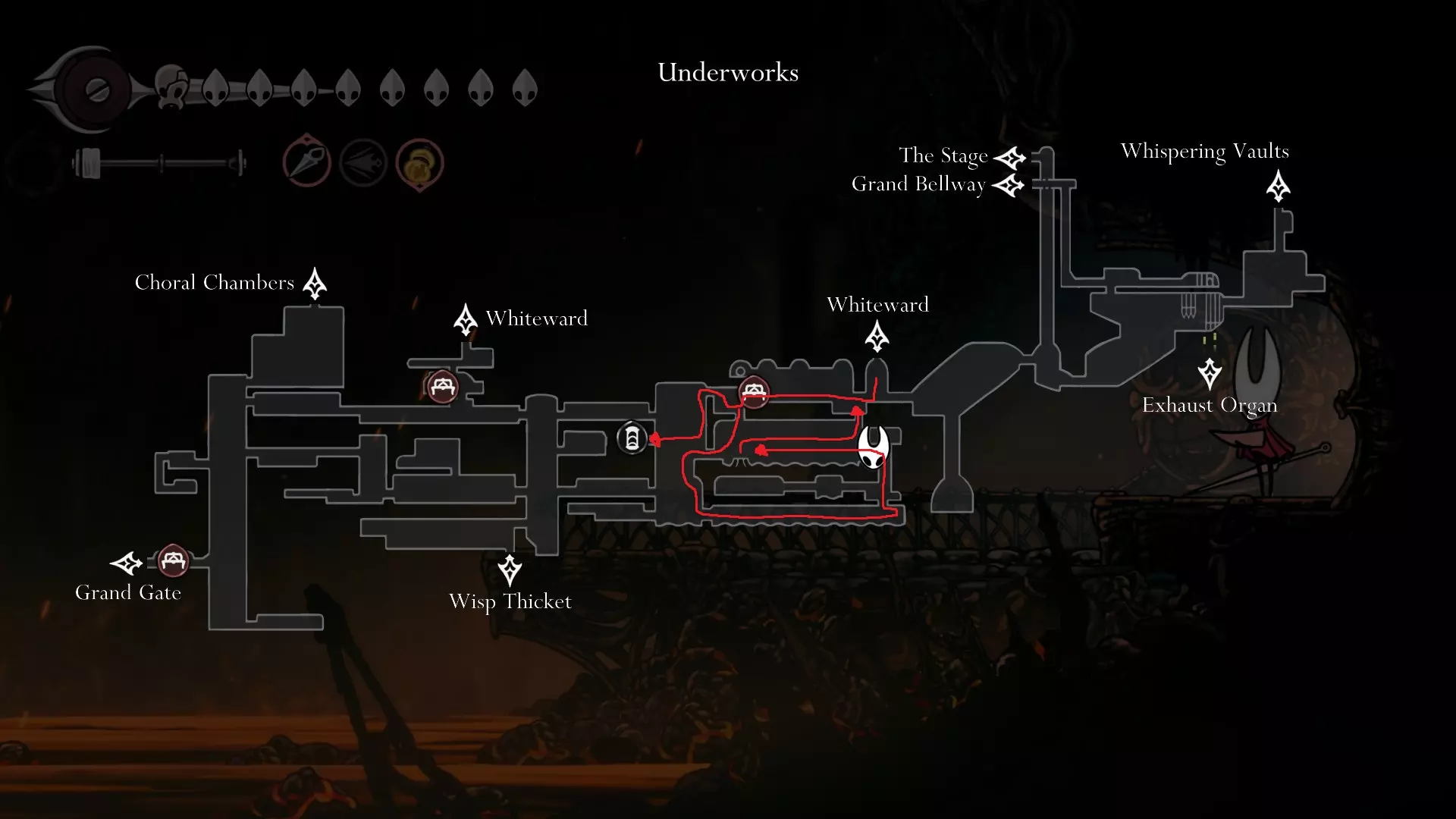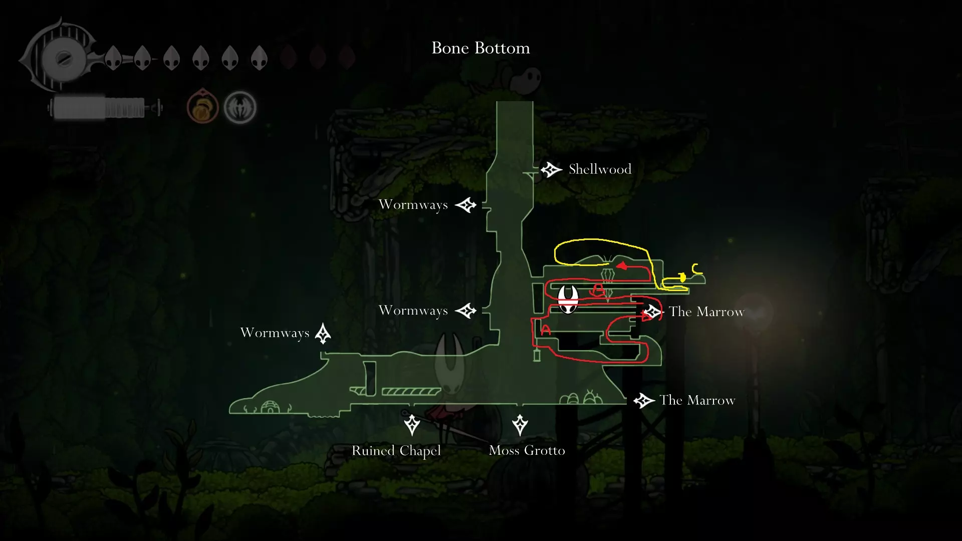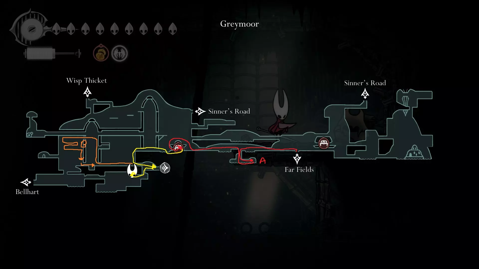4 things to do here; Start off going and opening the Song Clave shortcut. Thats your first step. Go down and proceed to get your Mask Shard at B.( finally another HP ) Once you get that, go follow the yellow route and get your free Memory Locket at C. Go down and go get your Pale Oil. You should be able to avoid all the mobster in the area. Lastly come out and follow the blue route to open Trobbio at E and then return to the train station to bench. Whats next? At this point now, you should be aiming for 7 things: Double Jump Drones Architect Crest Plasmium Phial Get More HP Get more Memory Locket Get more Spool Fragment Tool Pouch Upgrade I am not going to dictate where to go or what to do atm because its a huge work to upload and do but I will generally give some advice here. Mount Fay Cold Freeze can be negated with Flint Slate for a few seconds if you need the time. You need the simple key to open it so getting it from Pebb or Jubilana would work here. The other 2 keys are at Sands of Karak / Sinner Road so unless you have higher HP, dont bothered with the risk Drones are nice to have as it opens up more safety ( replacing your Red Tool ). You never take them off anyway so yea. Architect Crest needs 25 tools to be allowed for purchase and from what we have so far, we have, we should have: Warding Bell, Druid Eyes, Magma Bell, Straight Pins, Shard Pendant, Flea Brew, Injector Band, Compass as definite tools. What you could collect as quite safe are as follows: Magnetic Brooch, Snare Setter, Shell Satchel, Long Pin, if you bought the craftmetal from Pebb, Stingshard is available, Flintslate, Weighted Belt, Barbed Wire, Tacks, 3 Fold Pins, Drones, Plasmium Phial, Magnetite Dice, Ascension Grip, Silkspeed Anklets, Memory Crystal, Pollip Pouch, VoltVessel, 2 vendors items: Multibinder / Spool Extender. Plasmium Phial is straight forward, just collect 3 flowers. You can heal from the falling enemies that go pass by and collect 1 memory locket there. If you can also, you can collect the other silk skill but if you dont want, its fine~ you can visit Alchemist guy later in Act 3 and get that skill there if you feel stronger or when you start collecting fleas. Memory Locket, what you are missing atm: One in Bone Marrow where you got the flea, the bar in Greymoor, Bellhart Vendor, Blasted Steps, The Slab, Memorium, Underworks. Those are the safe ones. The more dangerous ones are Wormways, 2 at Bilewater, Sands of Karak, Deep Docks. The last 2 will only be obtainable in Act 3, Bellheart Top and Karmelita. Spool Fragment: You can look it up. Generally all of them are relatively safe except probably the Deep Docks one. Tool Pouch Upgrade is very simple to get. Damage Upgrades are from 12th Architect / Crawbuy Quest ( the Greymoor bar to kill x craws for the scarecrow ) / Grindle / Forge Daughter. The Capacity is from Nuu / Pilgrim Rest / Loddie ( the straight nail challenge ) and finally Flea to Fleatopia ( which is whatever ). Lastly, Mask Shards. You want to get the mask shards from this order: Mt Fay > Blasted Steps > Deep Docks > Wisp Ticket ( this being last cause its at the end of the Wisp Ticket so it would refill your HP to full ) Savage BeastFly Quest ( means you have to go through Hunter March and kill off the first Savage Beastfly. If you have drones here, it would help here, the next quest and the next mask ), Far Fields Lava Segment ( Drones + Pouch Upgrade both Damage and Capacity and full HP will help here since the lava stops when you recovered ), Putrified Ducts to get key to The Slab and lastly Bilewater because f*cking random fish doing 2 HP damage is crazy and getting that last means you can refill your HP. The worst part about this is that I would advice you to avoid the last 4, as it is the most dangerous and can kill the run. HOWEVER mask shards account for 100% sooooooooooo : ( . If you want, you can skip these 4 until you finish GMS and then collect those after. IF ANY SPOOL FRAGMENTS OR MEMORY LOCKET OR OTHER STUFFS ARE DANGEROUS, JUST AVOID IT UNTIL FINISHING GMS SO THAT AT LEAST YOU GET THE ACHIEVEMENT FOR STEEL SOUL. YOUR PRIORITY IS 8 MASK HP AND EVERYTHING ELSE LATER IS SECONDARY. DONT LOSE A RUN BECAUSE YOU HAVE TO DO AN ARENA THAT YOU WERENT PREPARE Below are some small video tips