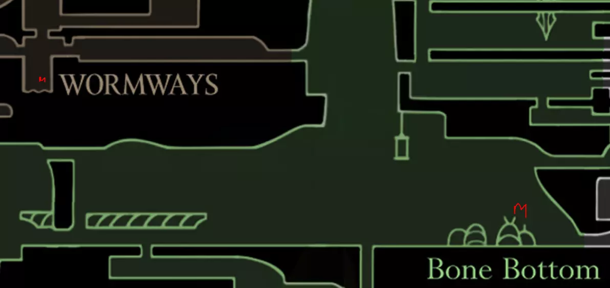我们为什么要拿这个?因为这是从骨髓阶段到岩浆铃(仅在熔岩环境中生效)/守护铃(相比被击中就会失去所有效果的防护,我更倾向于通过受击获得丝绸来治疗)阶段能获得的第一个蓝色护符。击败 Boss 并探索完苔藓洞穴后,前往骨底。骨底 + 骨髓。恭喜你到达骨底 + 骨髓区域。以下是你需要走的路线: