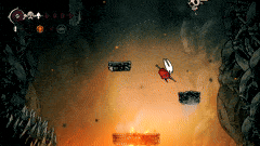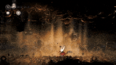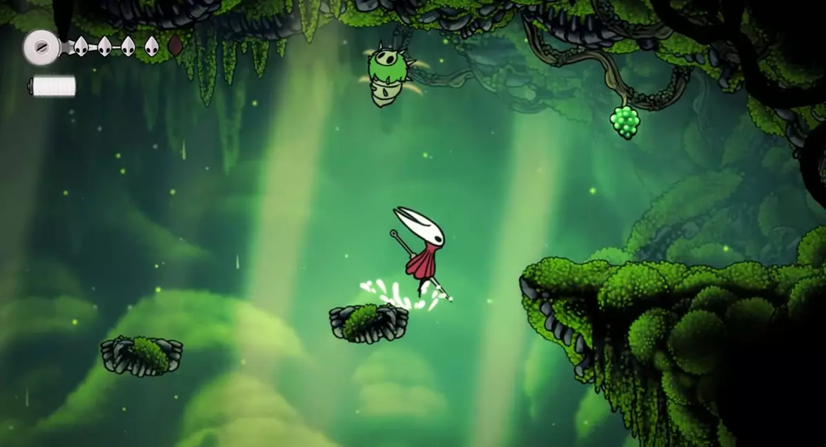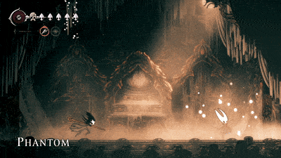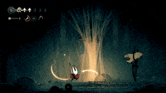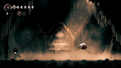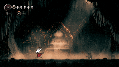 钟兽 钟兽拥有3套攻击招式,且很容易分辨它即将使用哪一种: 战斗开始时,它只会使用两种攻击。一种是跳跃越过玩家,另一种是从一侧向另一侧冲撞。 如果你看到侧边有震动,那就是它要进行侧向冲撞。你可以稳妥地用弹跳攻击(pogo)一次。 如果你看到震动但它发出咆哮,那就是跳跃攻击。轻轻跳起攻击它的上方,在它落地时再攻击两次。不要贪刀。 最后一种攻击是它在场地中央咆哮并掉落铃铛。你可以趁机偷砍一刀,但如果被铃铛击中,会损失2点生命值。 稳妥应对就好。在我的整个流程中,只败给过它一次。以下是当时的情况……