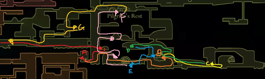 罪人之路…… 罪人之路和迷雾都比《Blasted Step》中的任何内容都要困难得多。这使得《Blasted Step》就像公园里的轻松散步,但之后你必须面对拥有更高生命值和伤害的 Boss。 不管怎样,回到罪人之路,从贝尔哈特乘坐火车前往灰沼,出站时要“小心”,因为沼翼可能会触发 Boss 战。如果发生这种情况,只需重新进入火车站再出站,然后向上走。不要太靠左走。避开沼翼,然后开始向罪人之路攀登,同时打开通往酒吧的电梯。你可以花费 10 串念珠来获取一些丝绸,如果是去罪人之路,你不妨把丝绸补满,为旅程做好准备。另外,如果你愿意的话,可以在 A1 处收集那只跳蚤(我猜是免费恢复丝绸)。这是你的路线: