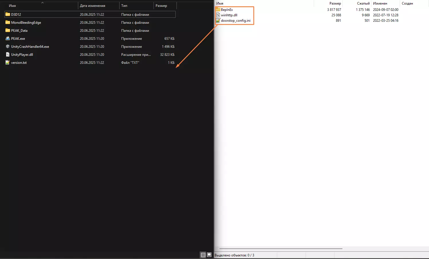 若要删除纹理翻译,需从PEAK_Data文件夹中删除以下文件:resources.assets、sharedassets3.assets、sharedassets4.assets。之后,进行文件验证,原始资源将被恢复。若要删除字体替换文件,需删除从压缩包中放入的相同文件:BepInEx、⚙️winhttp.dll、doorstop_config。赞助商 RTLC Team 向以下大佬致以无限敬意与崇高敬意: Leonag Gaming Arseny 0123 本名单包含向 RTLC Team 提供不足 2000 卢布支持的人士。 作者 纹理翻译:DimaLooper 字体替换:Hayrizan 原版字体俄化:damnxav