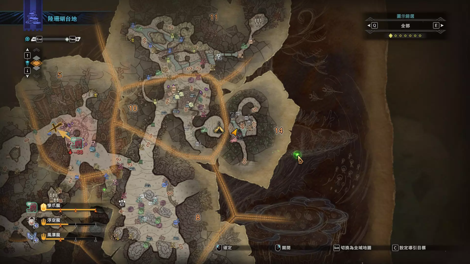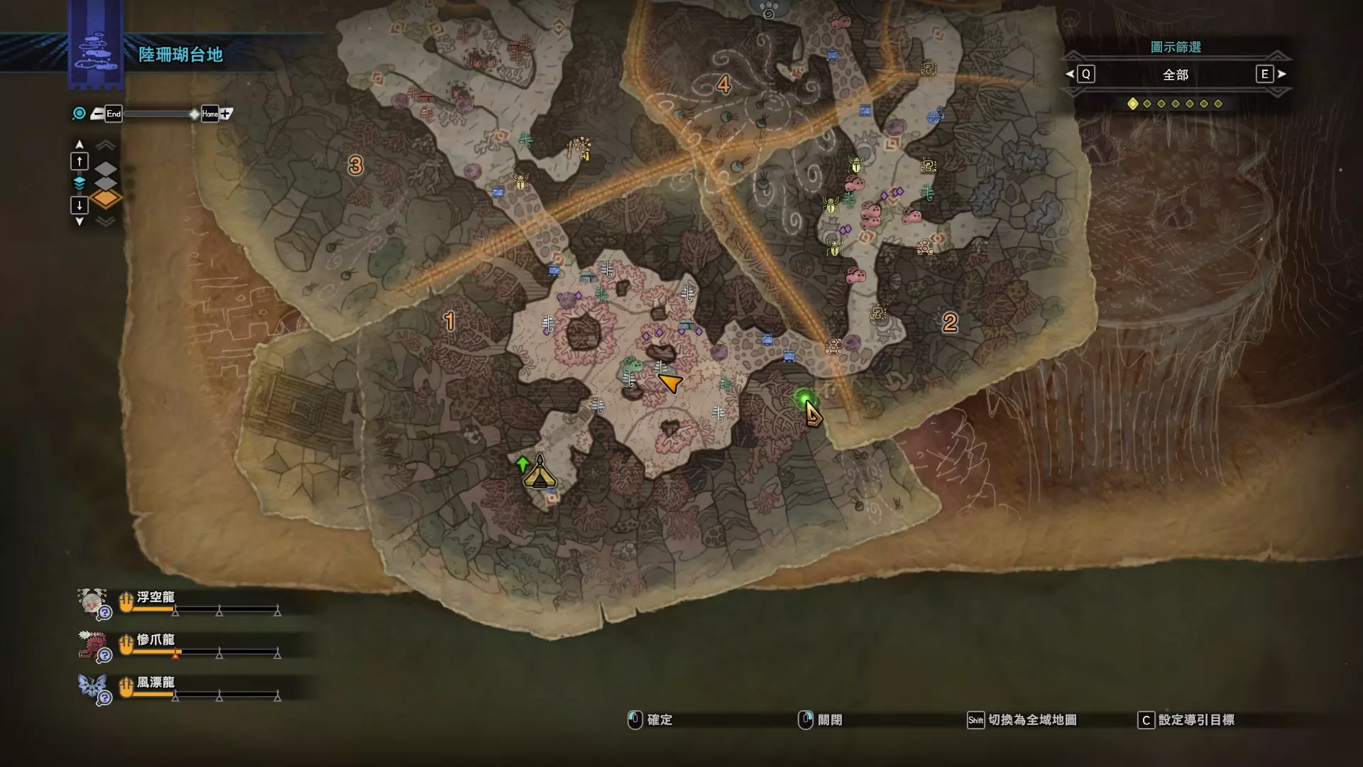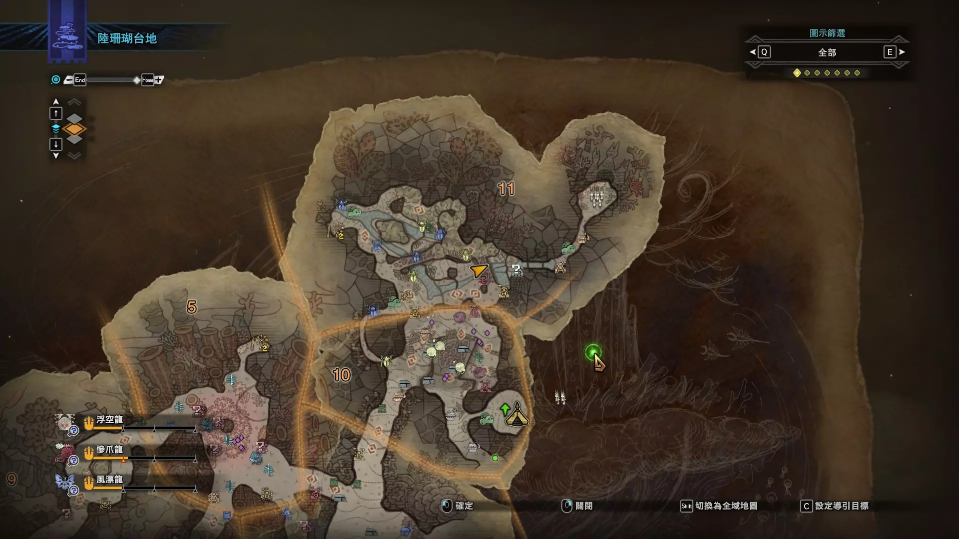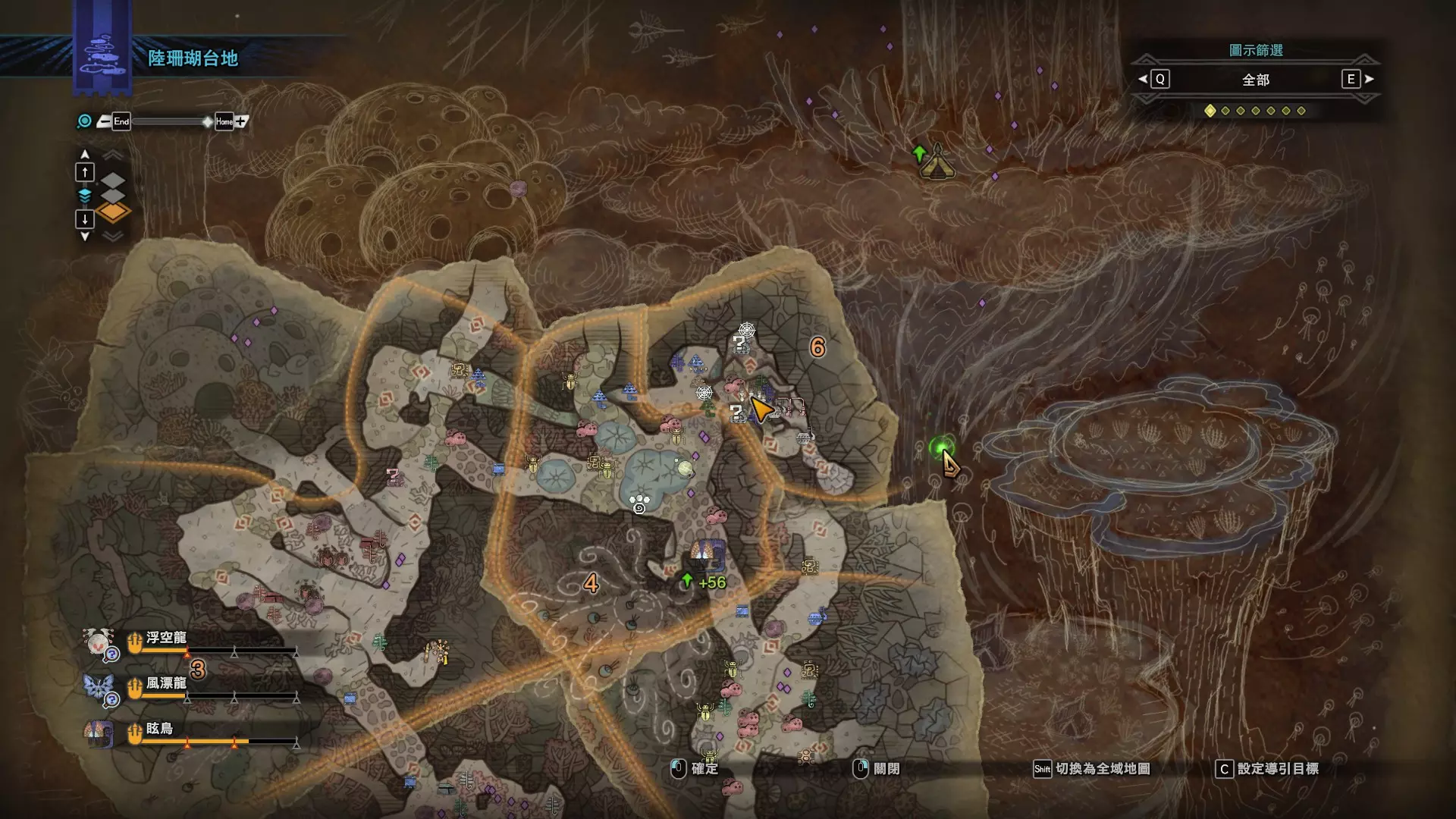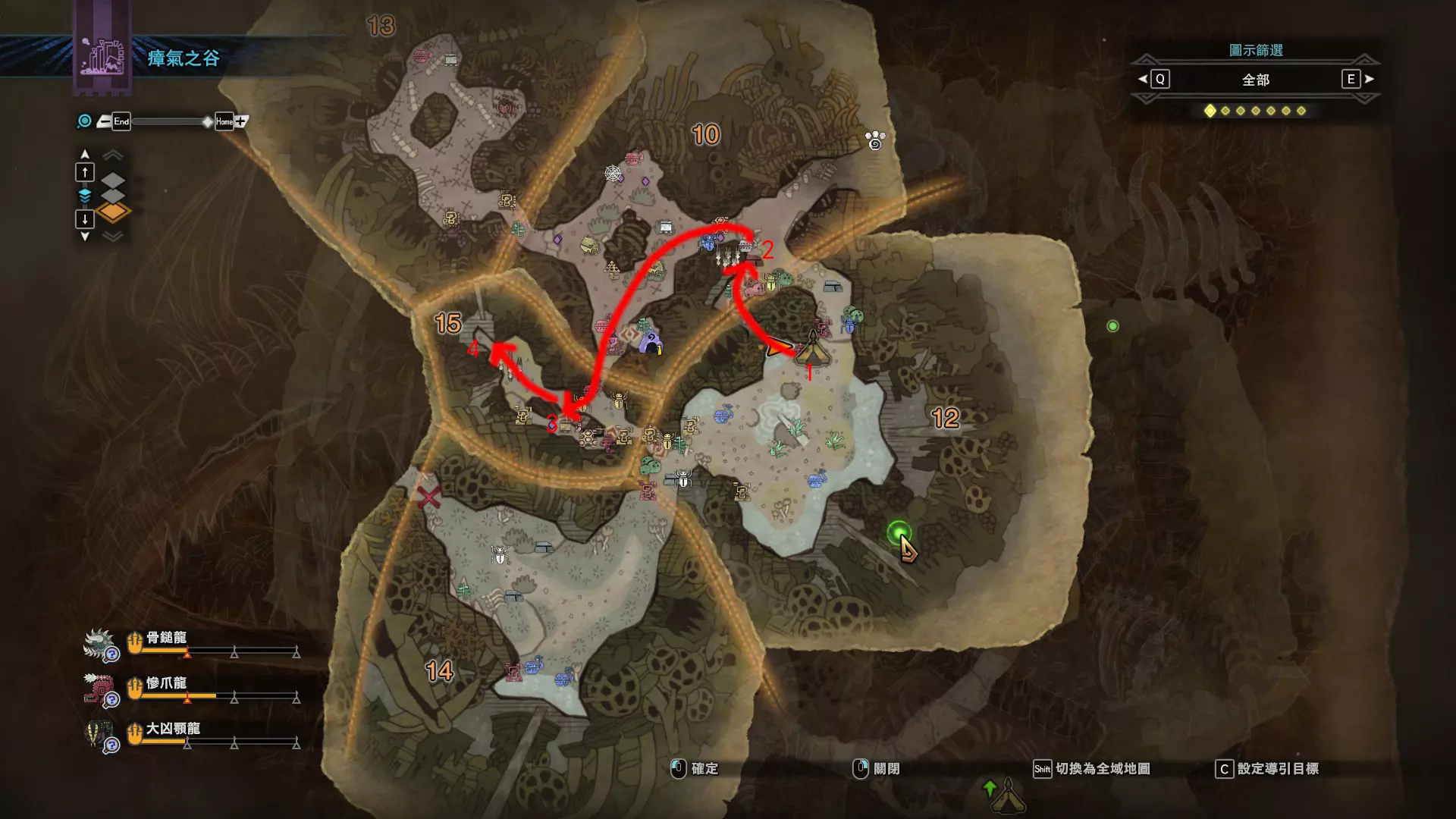 陆珊瑚台地 这张图没有推荐路线,主要是捕获「伶俐珊瑚鸟」和「摇曳鳗女王」,晚上时段在1区和3区到处逛就行,运气好的话一次就能遇到这两只稀有种环境生物 瘴气之谷 11区中央营地 [1],往下跳到高台,在光苔附近有几率能遇到「月光蜥蜴」——▶11区池塘 [2](6种巨大种鱼类)——▶15区池塘1 [3](2种巨大种鱼类)——▶15区池塘2 [4](化石汤釜和1种巨大种鱼类),到了15区后有几率会在菌猪背上遇到「粗毛秧鸡」