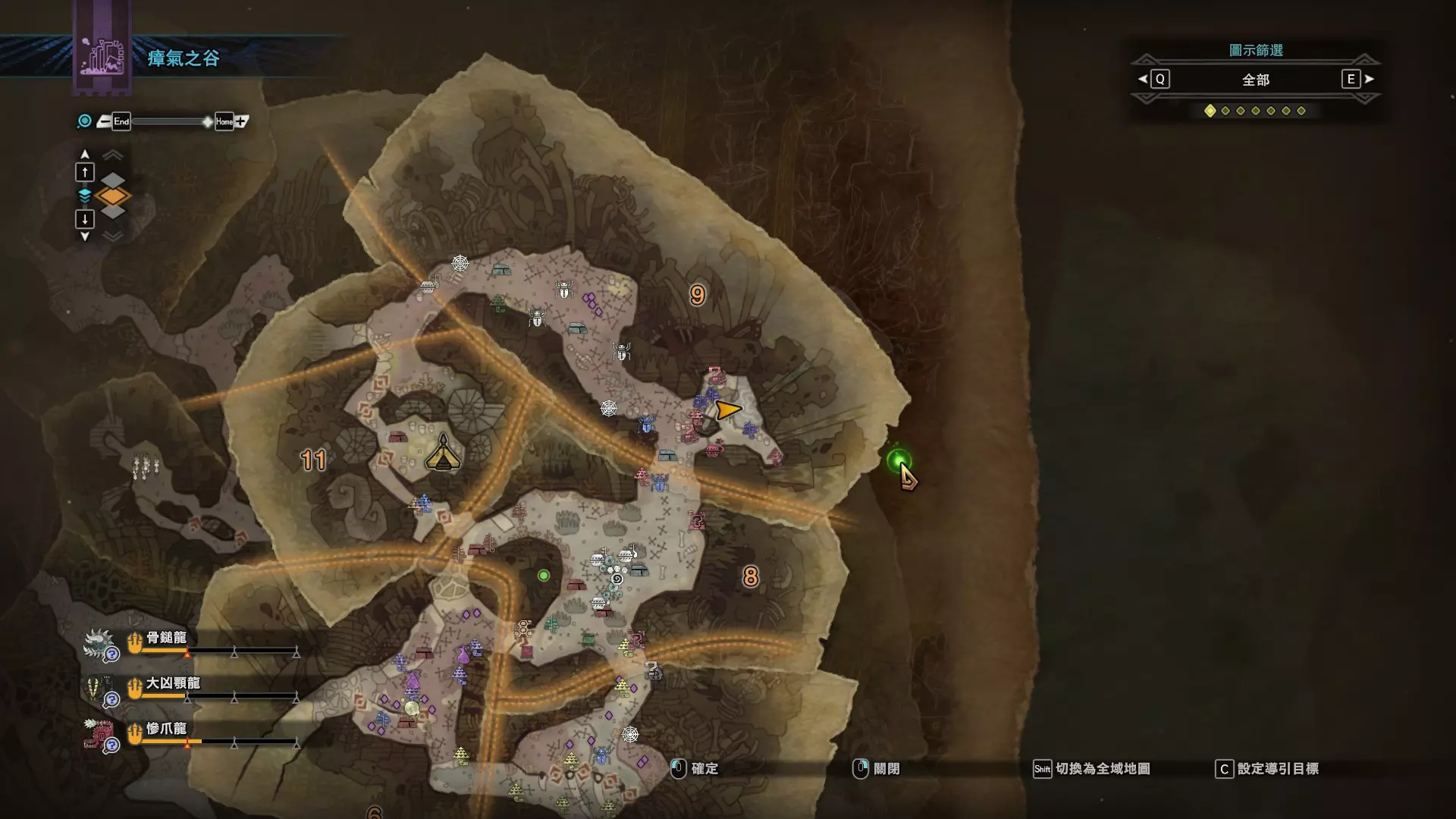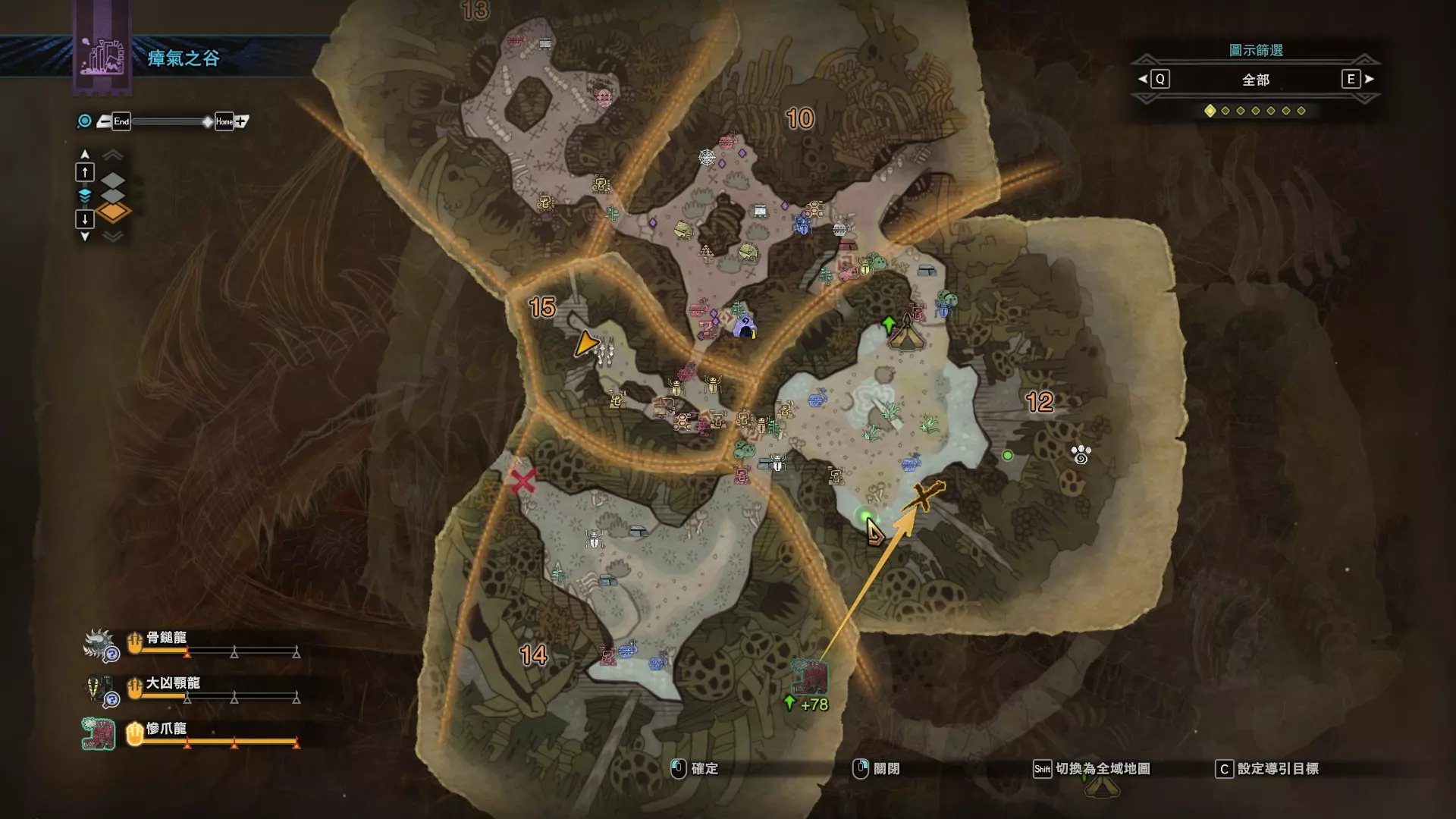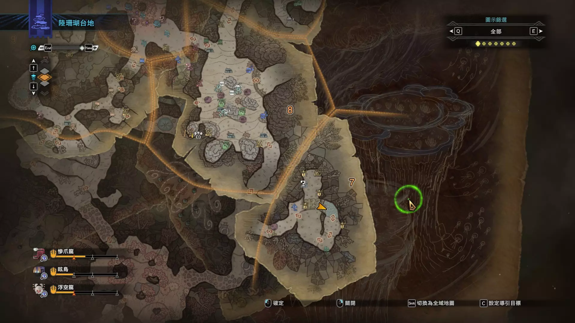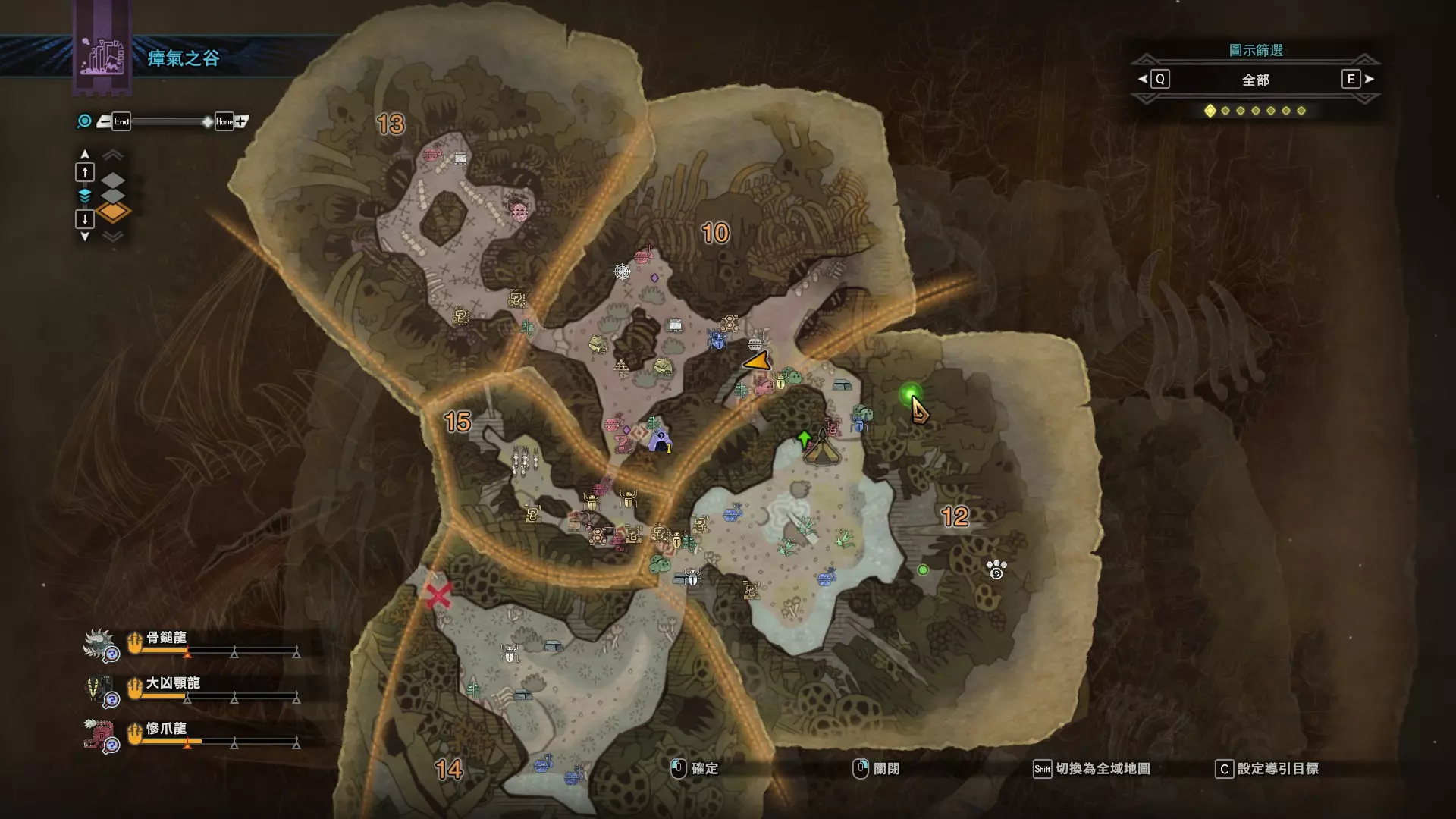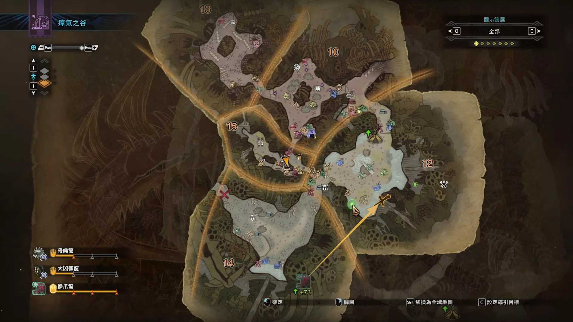 陆珊瑚台地 这张图没有推荐路线,主要是捕获「伶俐珊瑚鸟」和「摇曳鳗女王」,晚上时段在1区和3区到处逛就行,运气好的话一次就能遇到这两只稀有种环境生物 瘴气之谷 11区中央营地 [1],往下跳到高台,在光苔附近有几率能遇到「月光蜥蜴」——▶11区池塘 [2](6种巨大种鱼类)——▶15区池塘1 [3](2种巨大种鱼类)——▶15区池塘2 [4](化石汤釜和1种巨大种鱼类),到了15区后有几率会在菌猪背上遇到「粗毛秧鸡」