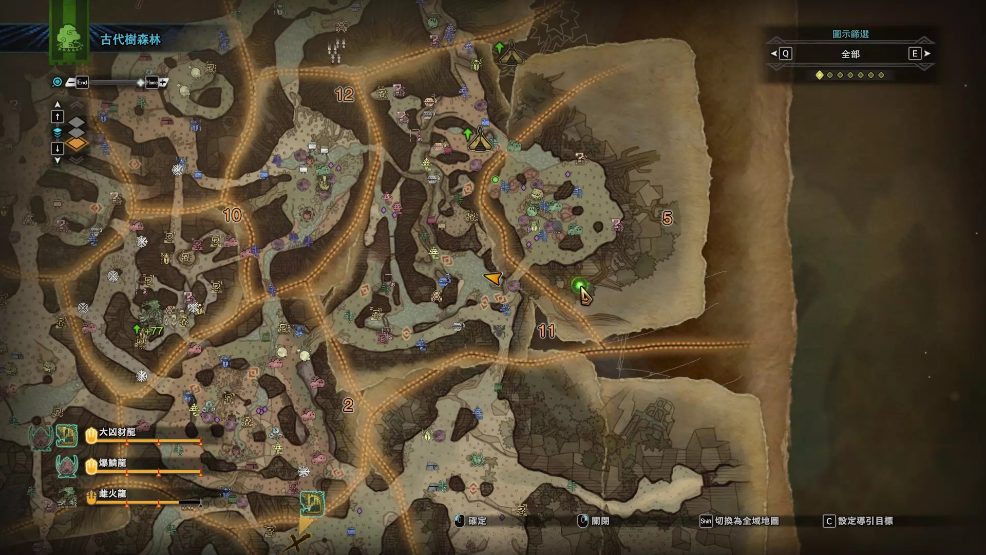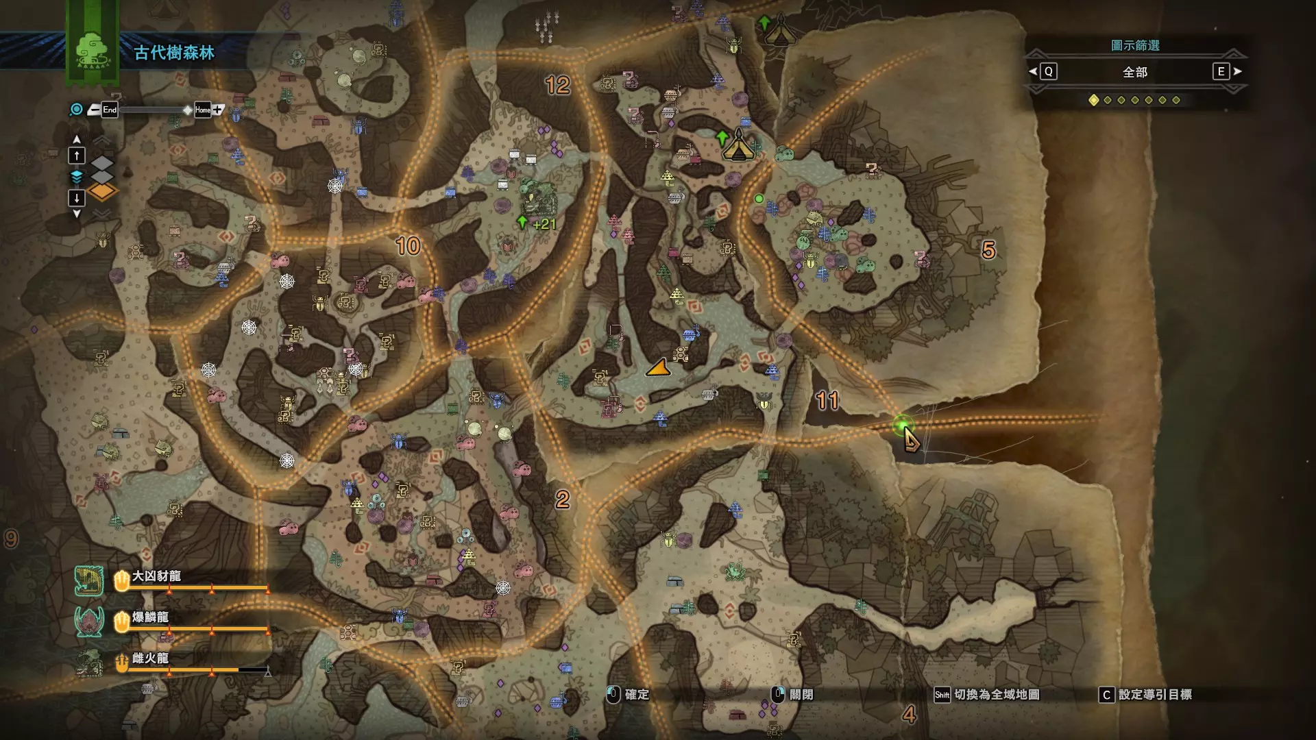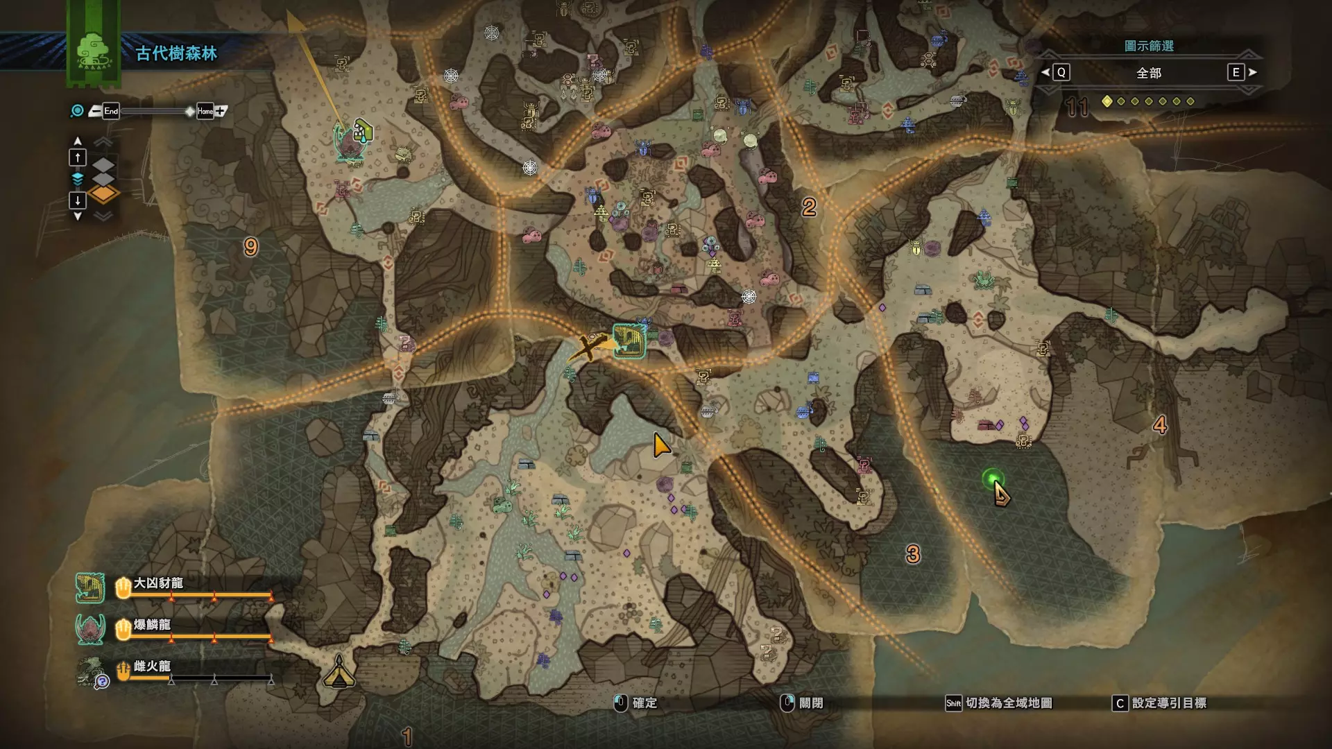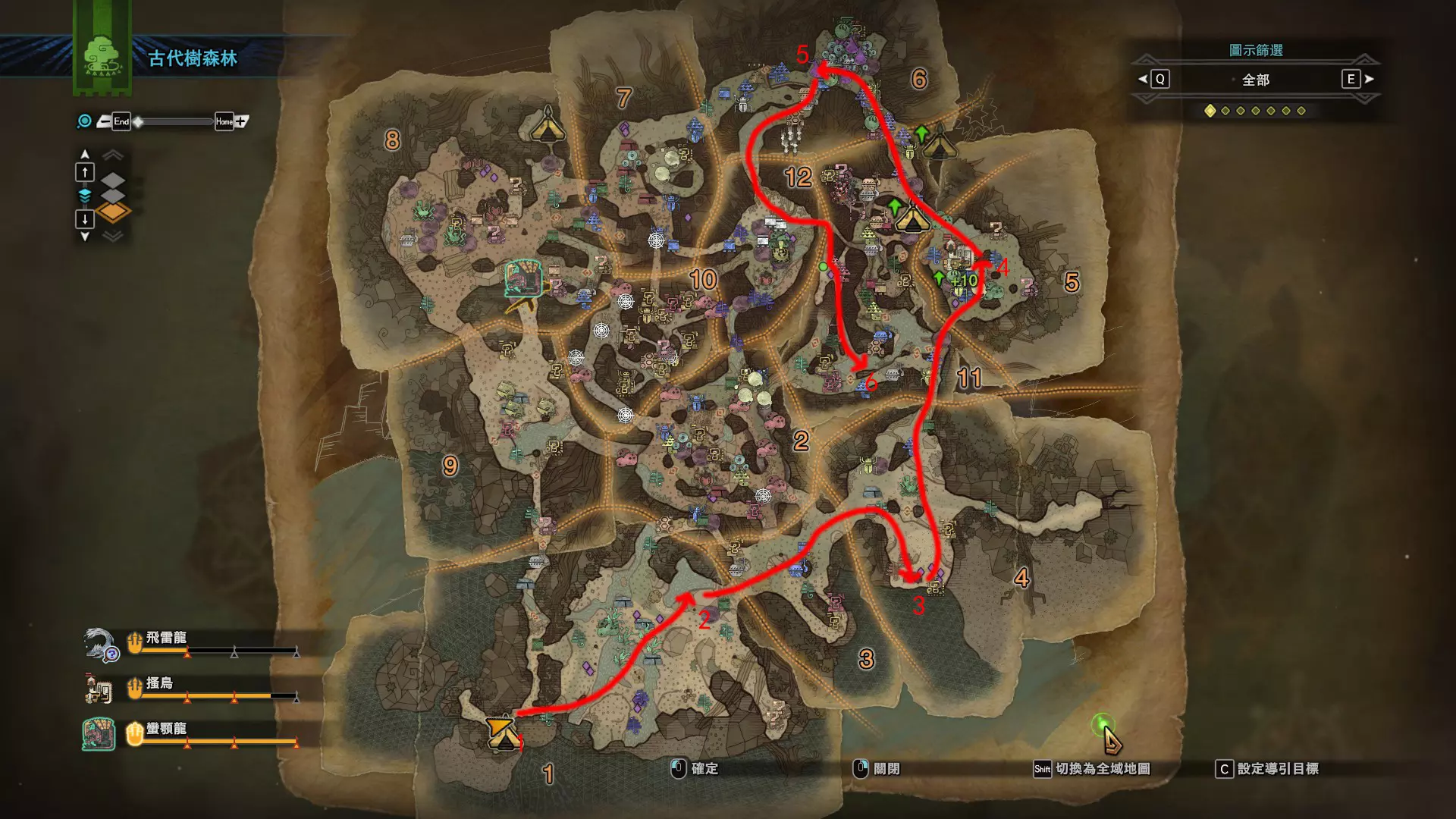 个人推荐的稀有种捕获路线与地点 ※某些稀有种环境生物只会在白天、晚上与恶劣天气时出现,记得规划好 古代树森林 ①1区西南营地 [1]——▶1区池塘 [2](3种巨大种鱼类),这段路上有几率能遇到「向导兔」和「柔毛秧鸡」 ②——▶4区海边 [3](旗鱼和5种巨大种鱼类)——▶5区 [4](始祖鸟的使者) ③——▶6区 [5](幽闪蝶)——▶11区池塘2 [6](3种巨大种鱼类),这段路上有几率能遇到「吉兆蜻蜓」,另外11区和12区之间的洞窟里也能遇到「幽闪蝶」