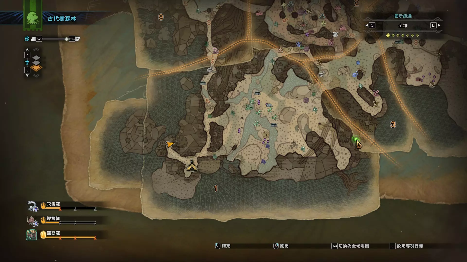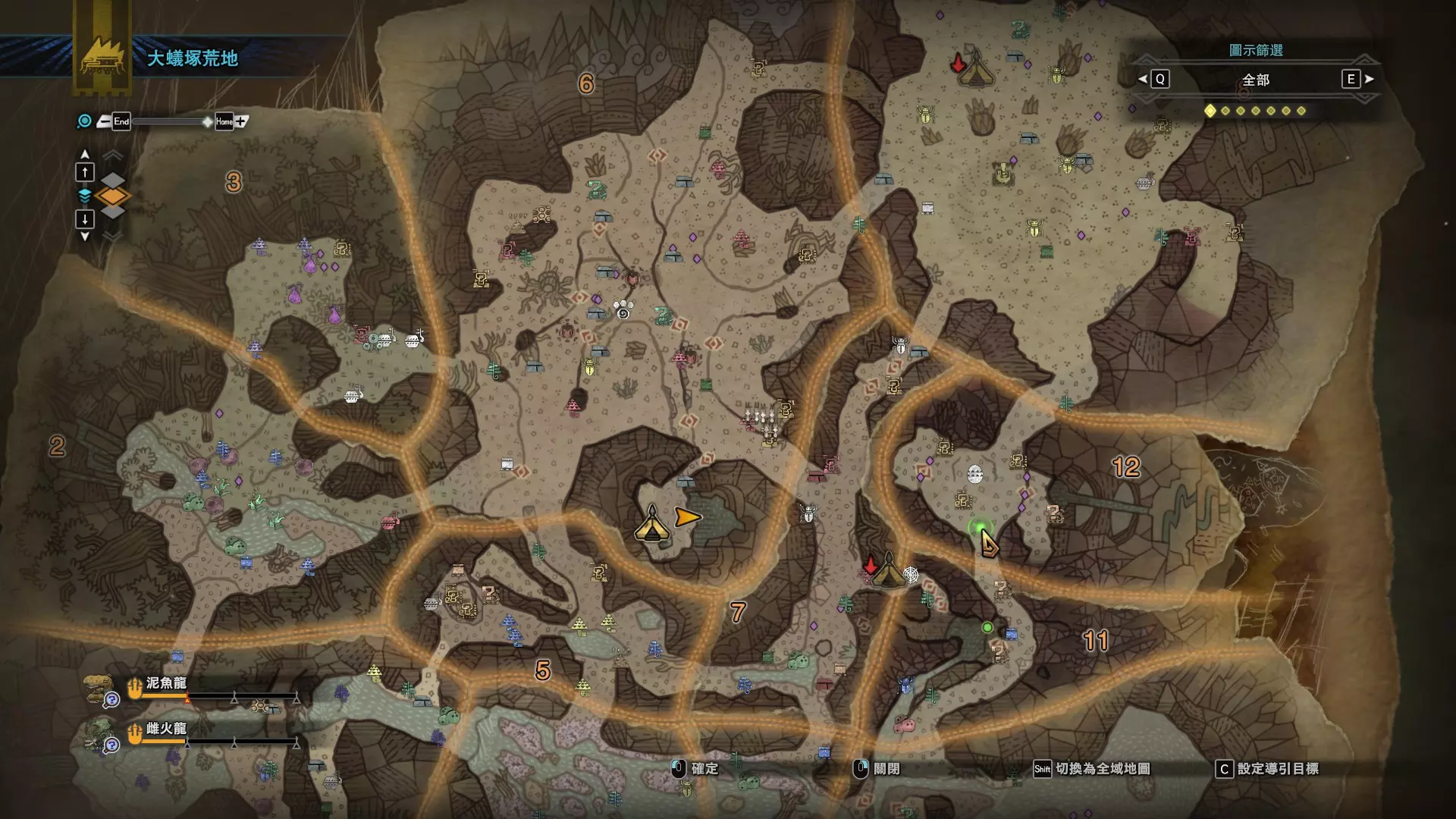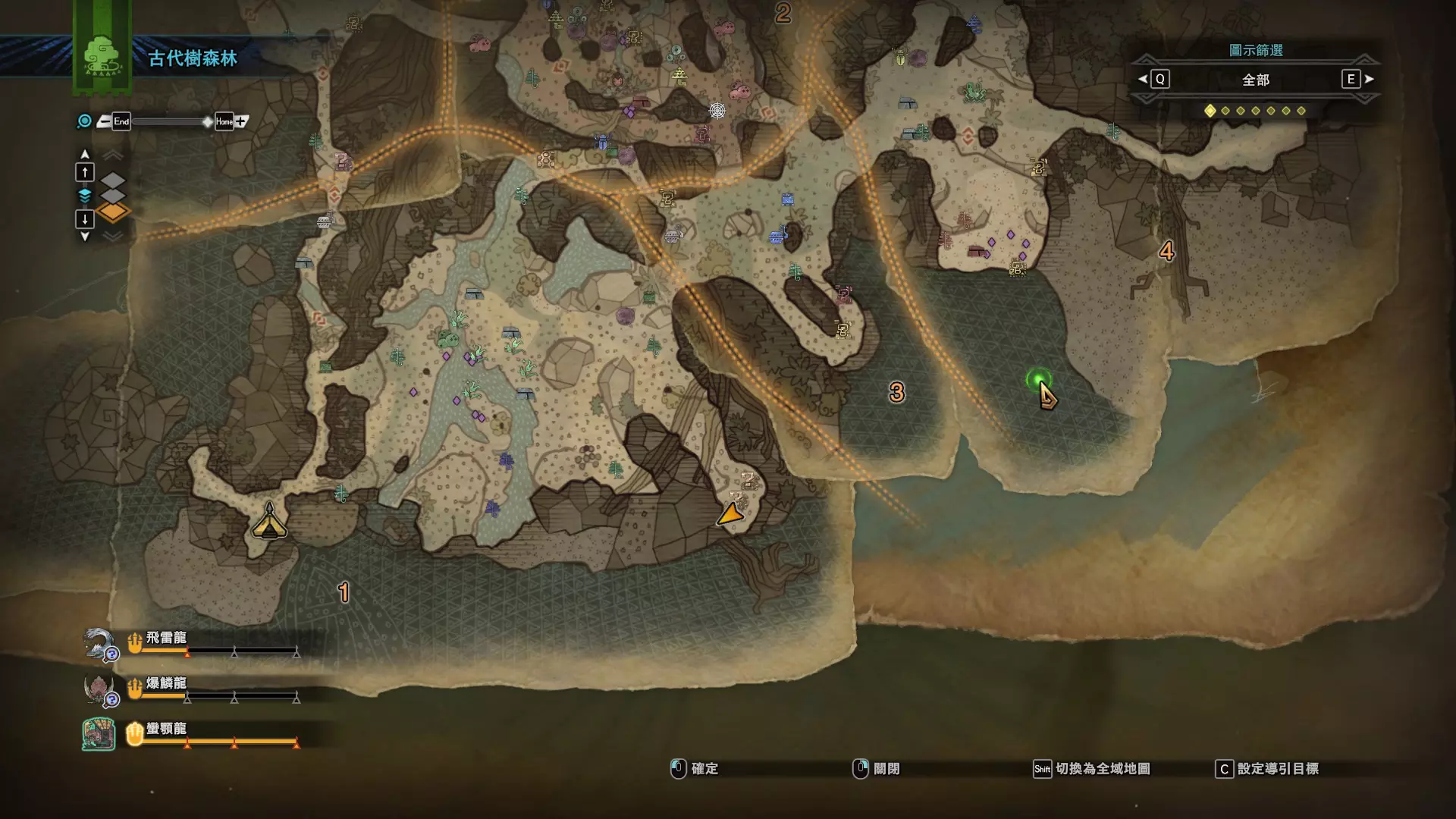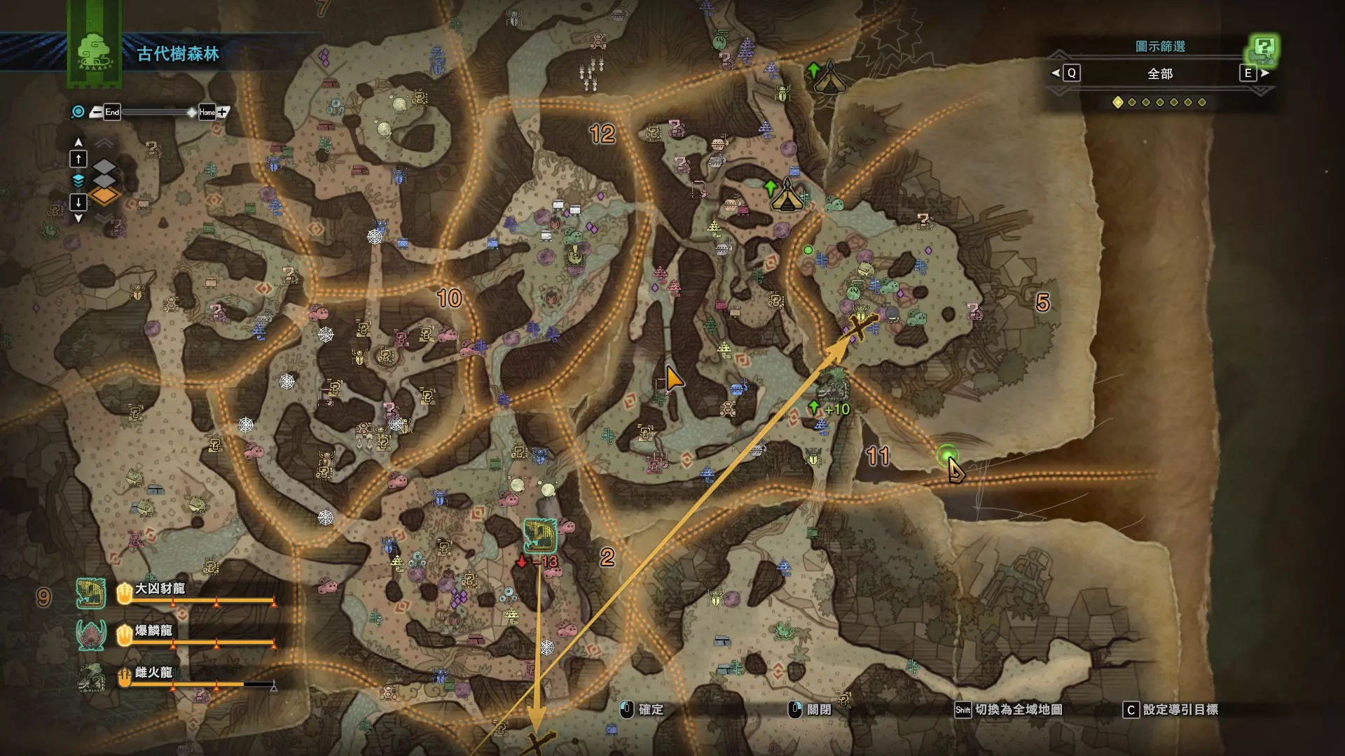 个人推荐的稀有种捕获路线与地点 ※某些稀有种环境生物只会在白天、晚上与恶劣天气时出现,记得规划好 古代树森林 ①1区西南营地 [1]——▶1区池塘 [2](3种巨大种鱼类),这段路上有几率能遇到「向导兔」和「柔毛秧鸡」 ②——▶4区海边 [3](旗鱼和5种巨大种鱼类)——▶5区 [4](始祖鸟的使者) ③——▶6区 [5](幽闪蝶)——▶11区池塘2 [6](3种巨大种鱼类),这段路上有几率能遇到「吉兆蜻蜓」,另外11区和12区之间的洞窟里也能遇到「幽闪蝶」