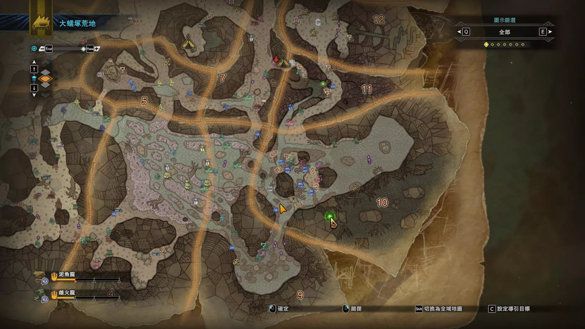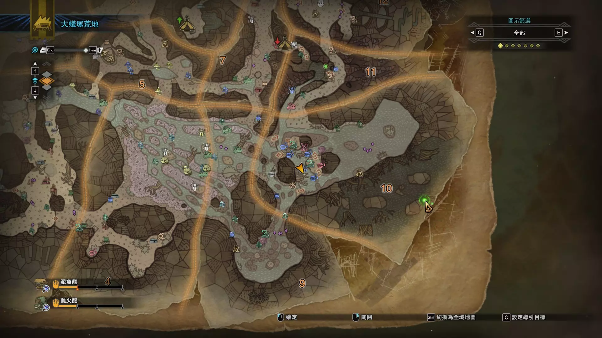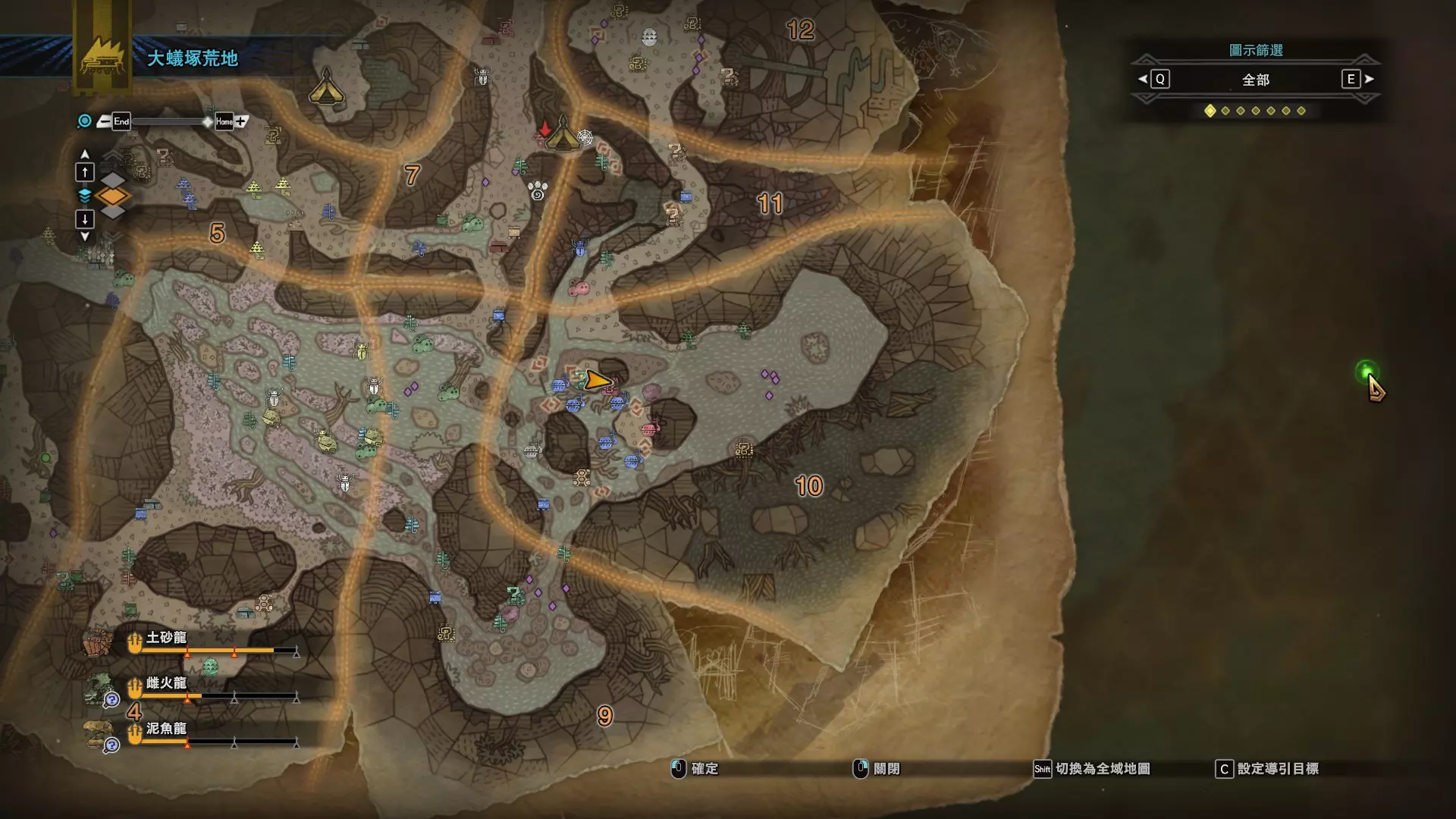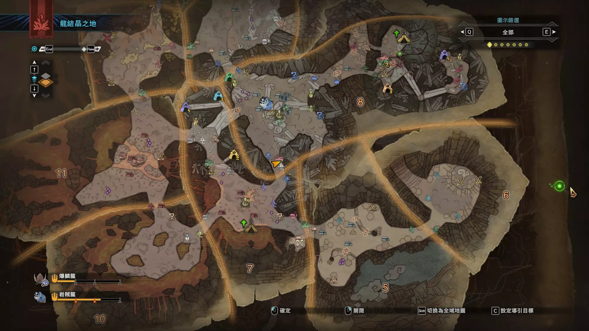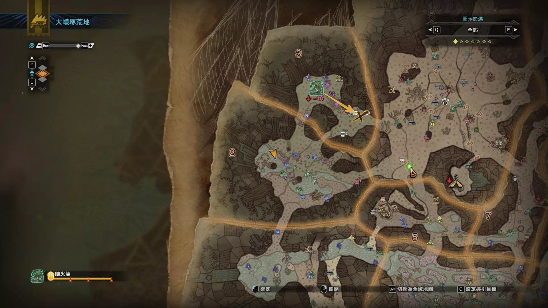 个人推荐的稀有种捕获路线与地点 ※某些稀有种环境生物只会在白天、晚上与恶劣天气时出现,记得规划好 古代树森林 ①1区西南营地 [1]——▶1区池塘 [2](3种巨大种鱼类),这段路上有几率能遇到「向导兔」和「柔毛秧鸡」 ②——▶4区海边 [3](旗鱼和5种巨大种鱼类)——▶5区 [4](始祖鸟的使者) ③——▶6区 [5](幽闪蝶)——▶11区池塘2 [6](3种巨大种鱼类),这段路上有几率能遇到「吉兆蜻蜓」,另外11区和12区之间的洞窟里也能遇到「幽闪蝶」