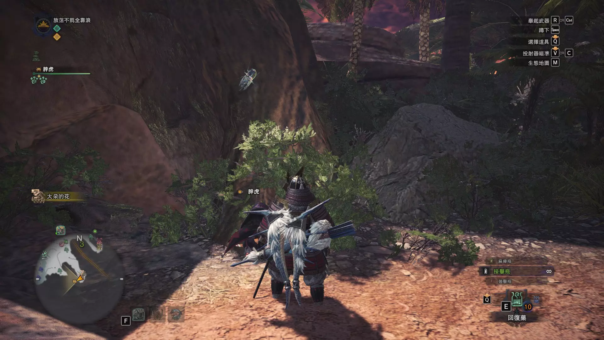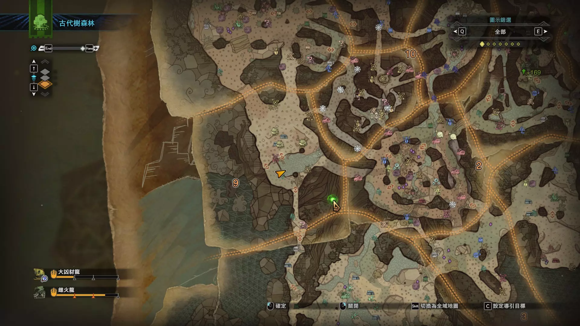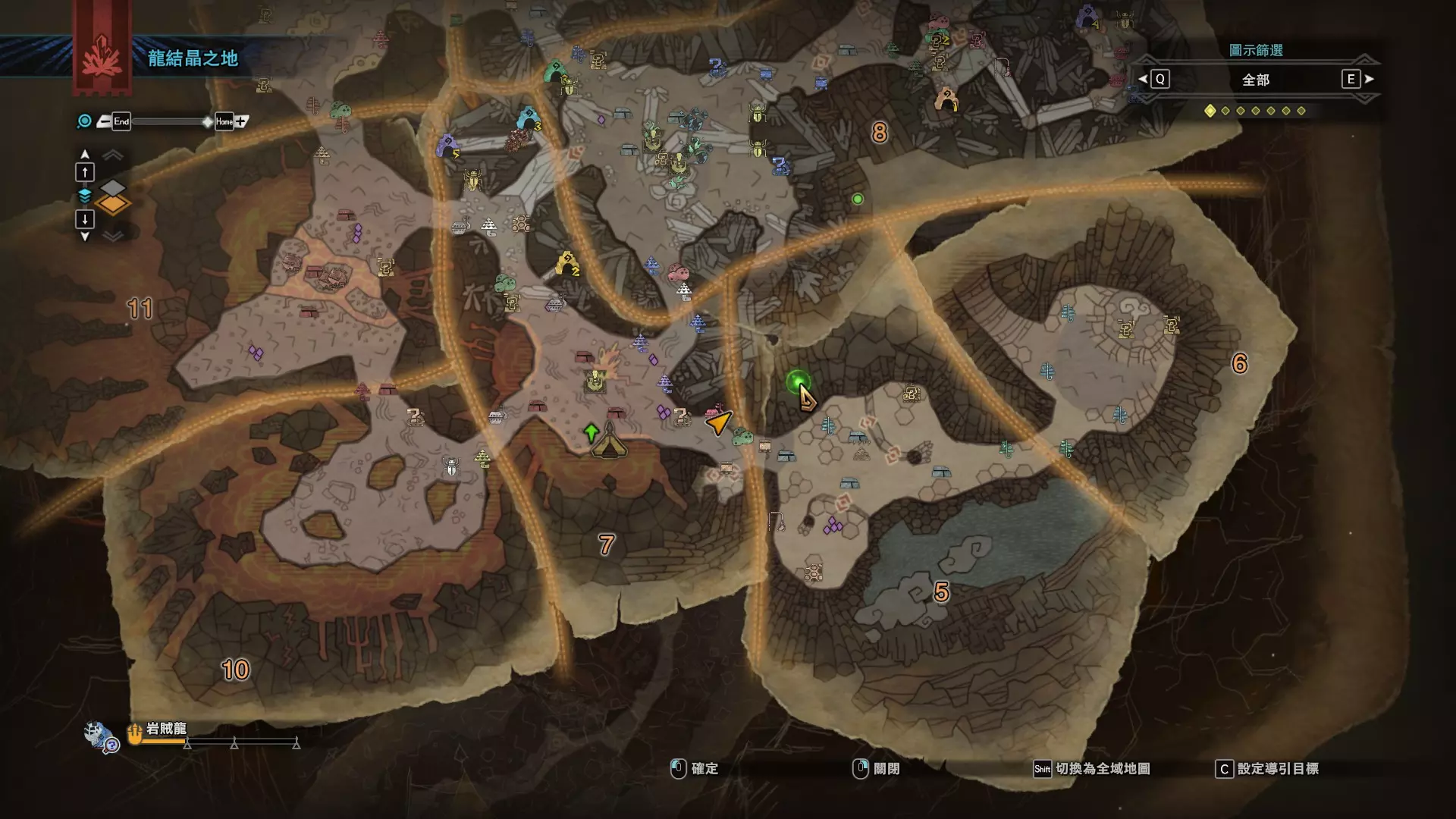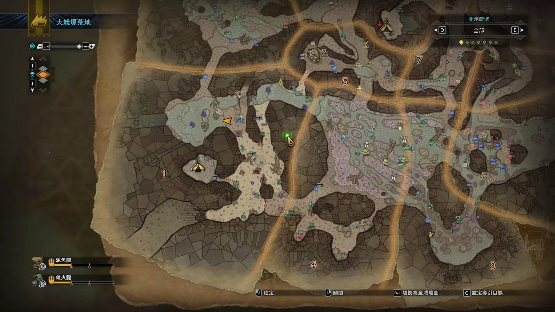个人推荐的稀有种捕获路线与地点 ※某些稀有种环境生物只会在白天、晚上与恶劣天气时出现,记得规划好 古代树森林 ①1区西南营地 [1]——▶1区池塘 [2](3种巨大种鱼类),这段路上有几率能遇到「向导兔」和「柔毛秧鸡」 ②——▶4区海边 [3](旗鱼和5种巨大种鱼类)——▶5区 [4](始祖鸟的使者) ③——▶6区 [5](幽闪蝶)——▶11区池塘2 [6](3种巨大种鱼类),这段路上有几率能遇到「吉兆蜻蜓」,另外11区和12区之间的洞窟里也能遇到「幽闪蝶」