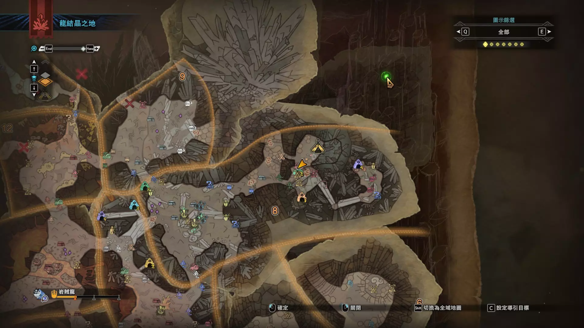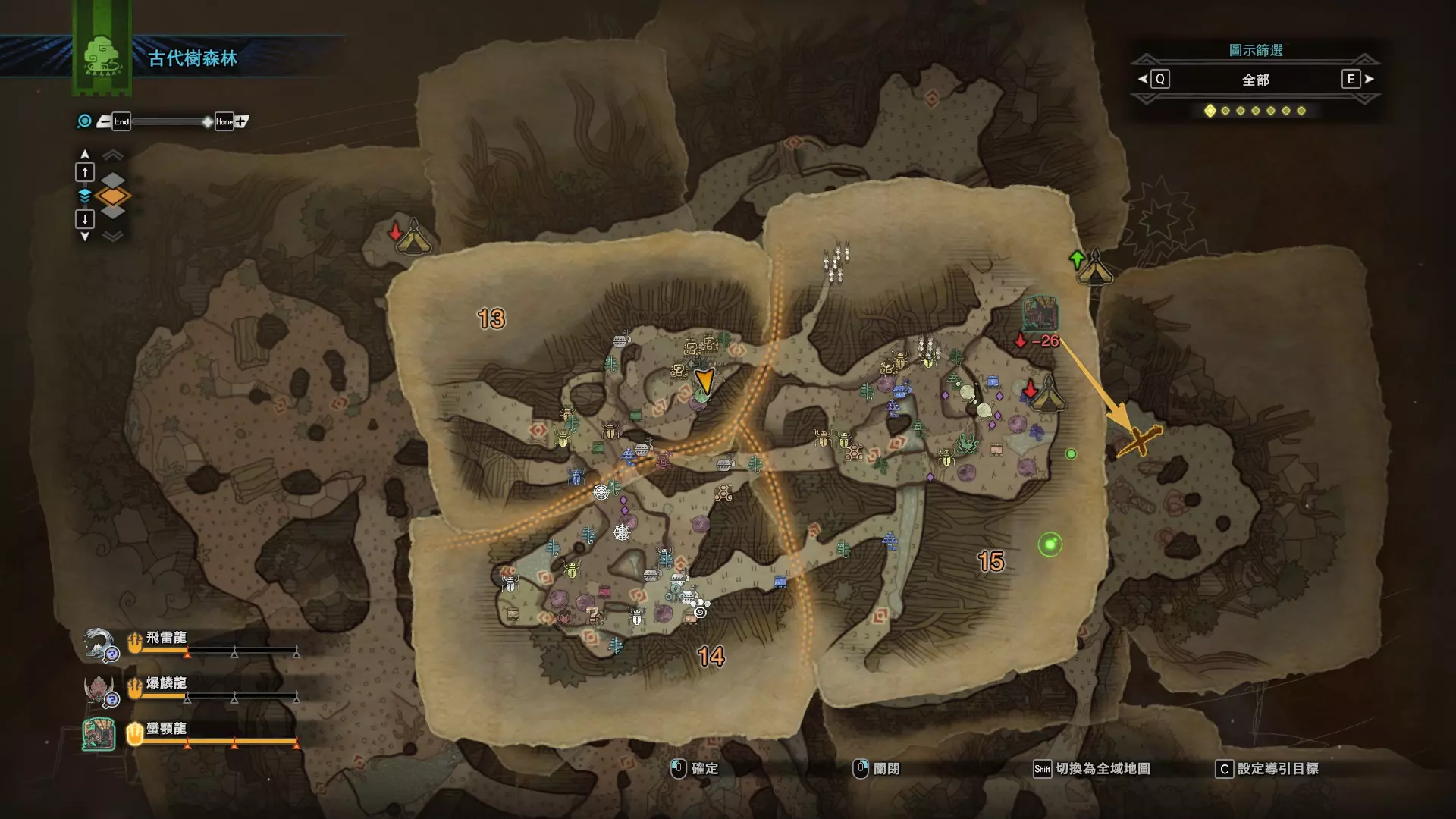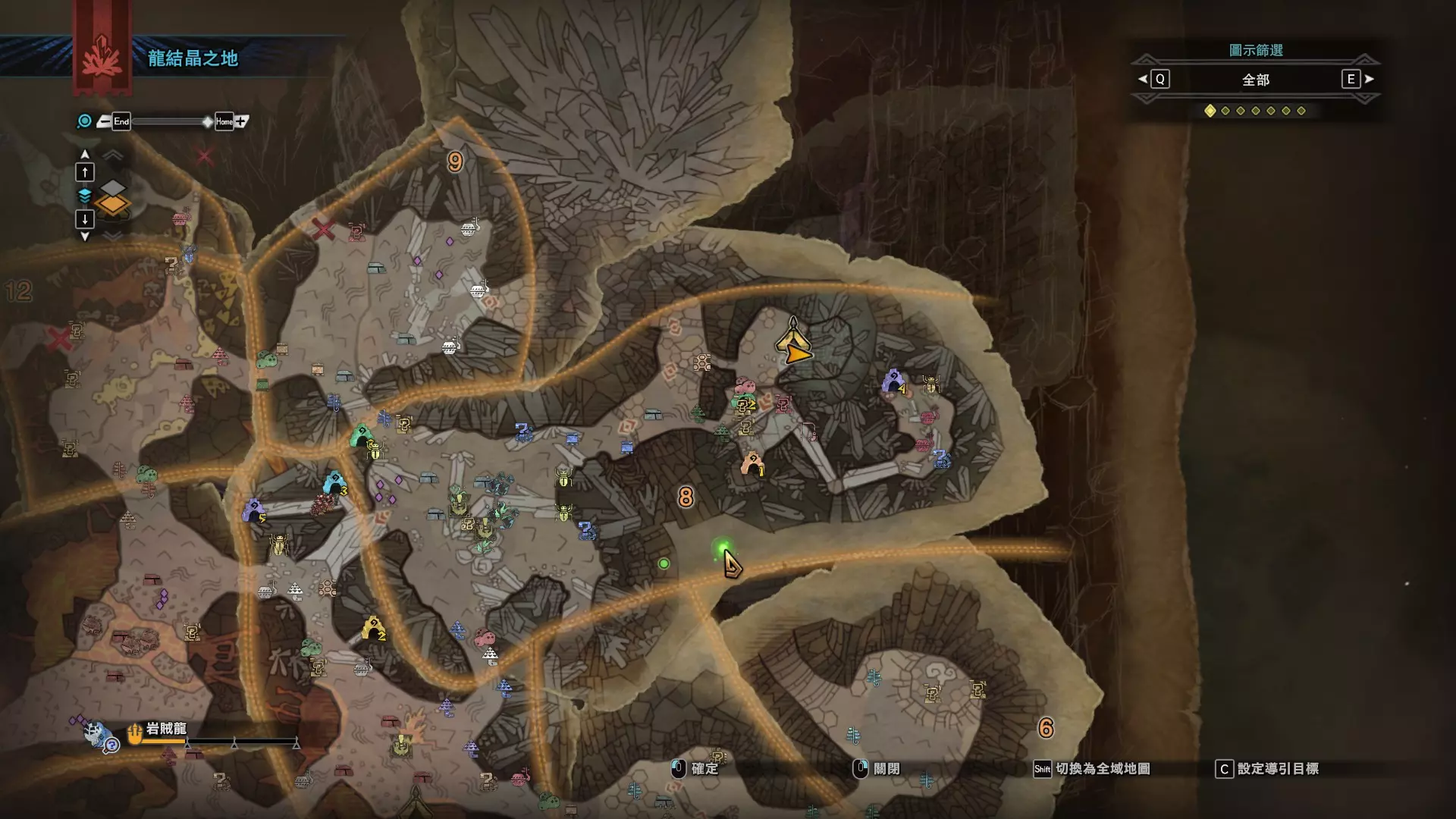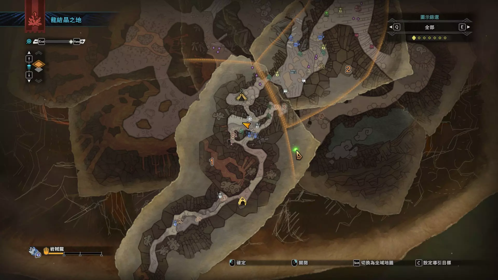 个人推荐的稀有种捕获路线与地点 ※某些稀有种环境生物只会在白天、晚上与恶劣天气时出现,记得规划好 古代树森林 ①1区西南营地 [1]——▶1区池塘 [2](3种巨大种鱼类),这段路上有几率能遇到「向导兔」和「柔毛秧鸡」 ②——▶4区海边 [3](旗鱼和5种巨大种鱼类)——▶5区 [4](始祖鸟的使者) ③——▶6区 [5](幽闪蝶)——▶11区池塘2 [6](3种巨大种鱼类),这段路上有几率能遇到「吉兆蜻蜓」,另外11区和12区之间的洞窟里也能遇到「幽闪蝶」