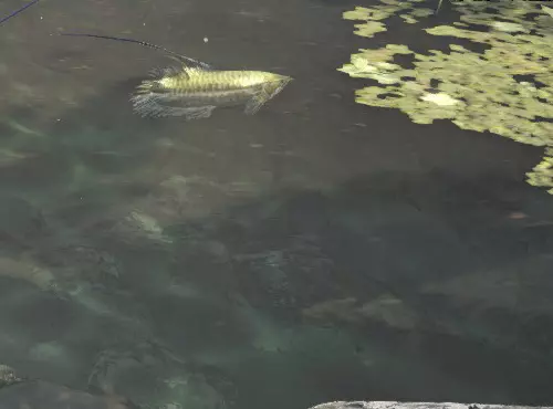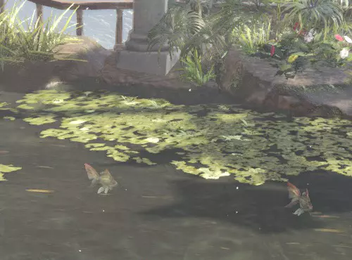 龙结晶之地7区和5区之间过道的池塘 鱼类:粉色异形鱼、刺身鱼、白金鱼