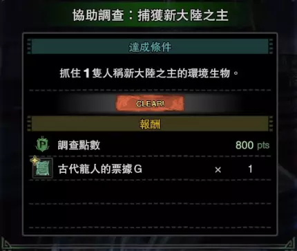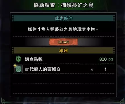 个人建议在第一次捕获「化石汤釜」和「柔毛秧鸡」前先把「孤高的鱼类调查员」和「热情的生物调查员」的最后一个任务接了,因为这两个任务刚好要求你去捕获这两只稀有种环境生物。即使你之前捕获过,调查员还是会让你再捕获一次。虽然多刷新几次地图总能抓到,但这样会浪费不少时间。 「协助调查:捕获新大陆之主」——捕获「化石汤釜」 「协助调查:捕获梦幻之鸟」——捕获「柔毛秧鸡」