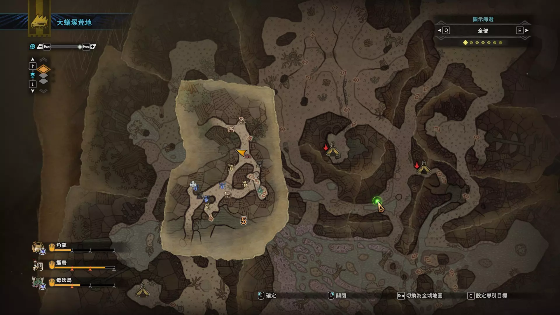 大蚁塚荒地 没什么好的路线 1区西南营地 [1]——▶10区池塘下层 [2](2种巨大种鱼类),这段路上有几率能遇到「向导兔」「柔毛秧鸡」「绿宝石鲎」——▶快速传送到6区中央营地池塘2 [3](5种巨大种鱼类)