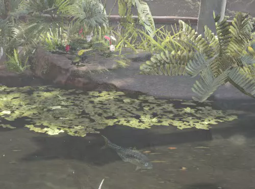 陆珊瑚台地11区池塘 鱼类:粉色异形鱼、坚硬竹荚鱼、刺身鱼、破裂龙鱼,周边有行灯鱼