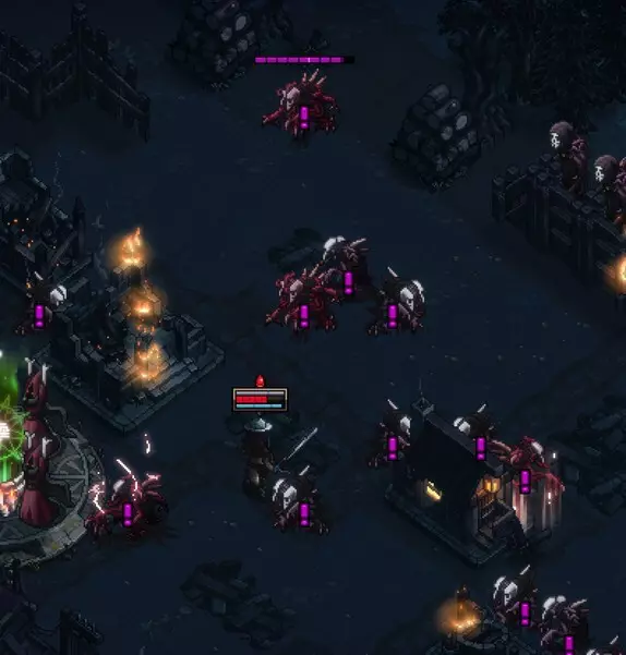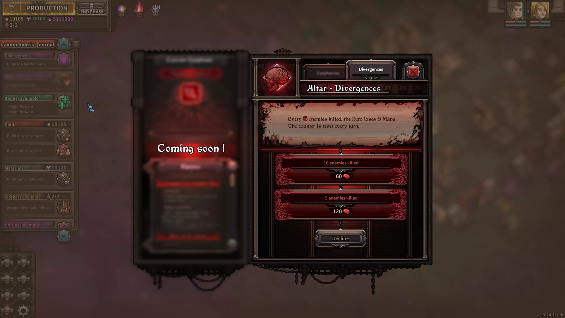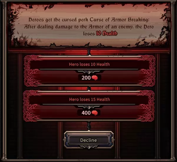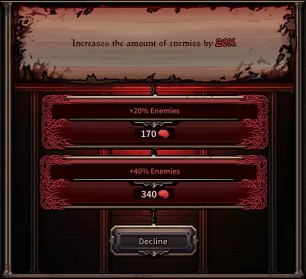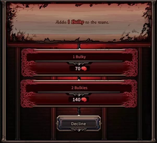 [界面开发中] 标准分歧:一种会使即将到来的夜晚对玩家更难的效果。这是分歧的基础版本。 强效分歧:标准分歧的“硬核”版本。效果相同,但强度更高。作为交换,它会提供更多奖励。 拒绝:此选项会使即将到来的夜晚保持不变,但不会给予任何奖励。 分歧可以有各种各样的效果,例如增加更多敌人、强化敌人,甚至对英雄施加不利影响。当分歧出现时,其效果是随机选择的,因此即使你反复游玩同一张地图,每次运行都会遇到不同的分歧。我将在后续的博客文章中预告一些可能的效果。《歧路旅人》的核心目标是让玩家有机会承担风险并增加即将到来的夜晚的难度——这是类 rogue 游戏中常见的机制。但它还带来了其他东西:玩家可以更仔细地规划夜晚,因为“歧路”能让他们更准确地了解即将面临的挑战。这一点在“先知”机制中已有体现,但“歧路”确实对此进行了扩展。例如,如果你看到一个会在波次中添加大量“被诅咒者”的“歧路”,你可能会想给一到两名英雄装备魔法武器。 “歧路”的难度会随夜晚和地图而变化,因此“埃尔德利希特”第 10 夜的“歧路”效果可能会比“莱克堡”第 2 夜的“歧路”强得多。