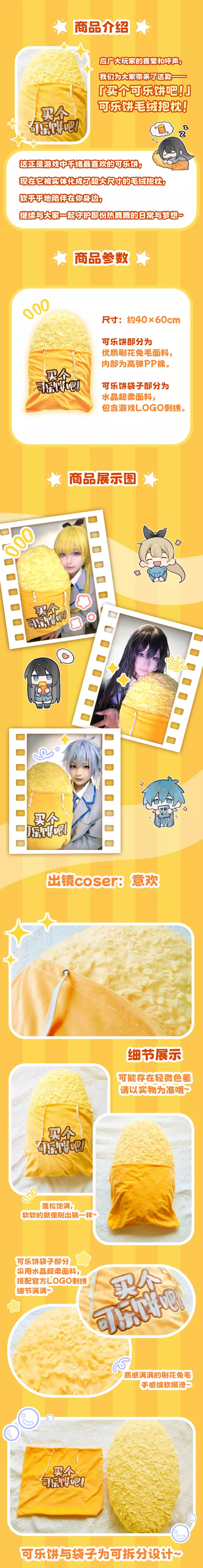 在千绪奋战的长野街头,最重要的目标当然是——买个可乐饼!✨ 现在,千绪最爱的那块金黄酥脆的可乐饼,终于实体化为超大毛绒抱枕,可以陪你一起入梦啦! 通贩时间:2025年7月27日晚20:00起(预计持续2个月左右) 通贩店铺:淘宝店铺【梦结界工作室】 通贩价格:82元 抱枕参数:尺寸约 40×60cm,可乐饼部分为优质刷花兔毛面料,内部为高弹PP棉。可乐饼袋子部分为水晶超柔面料,包含游戏LOGO刺绣 注意:抱枕为预售,预计拍下后一个月内发货~ 详细信息请见图片。
