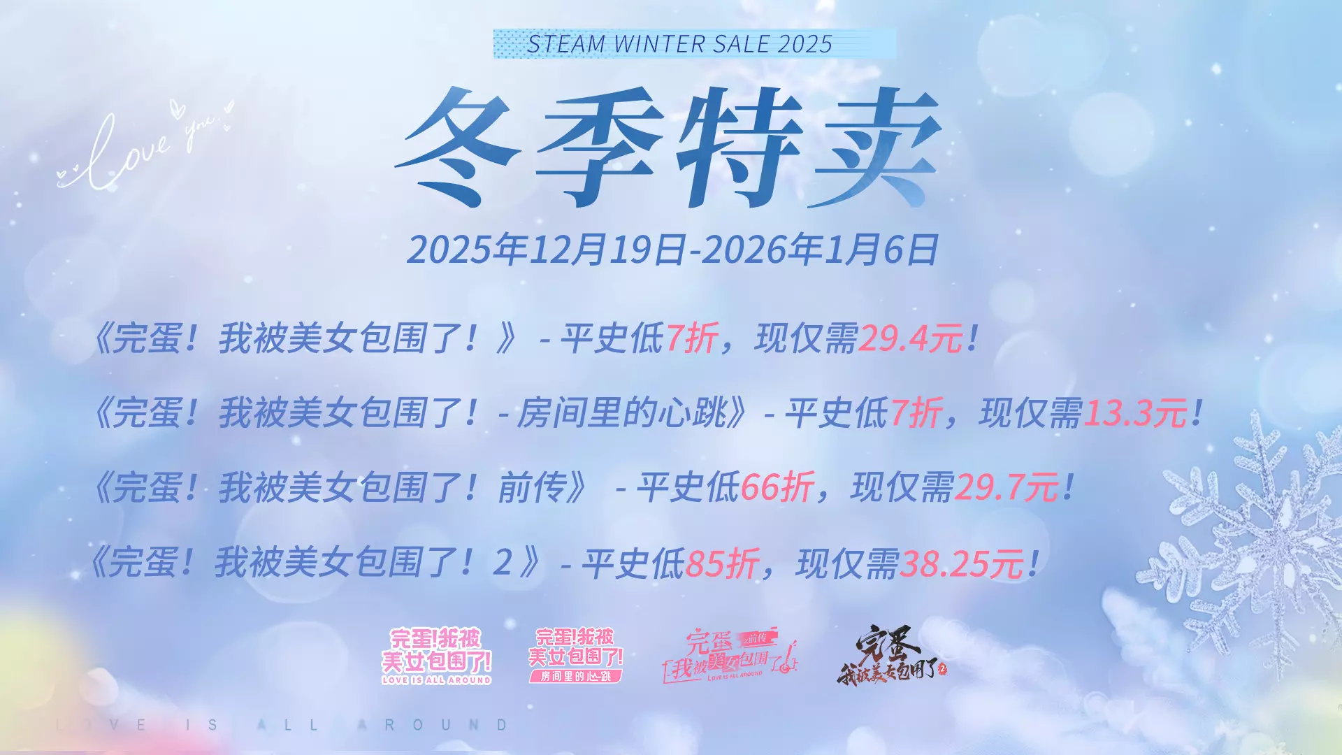 Steam冬季特卖活动将于北京时间12月19日-1月6日开启,《完蛋!我被美女包围了!》系列迎来平史低特惠。