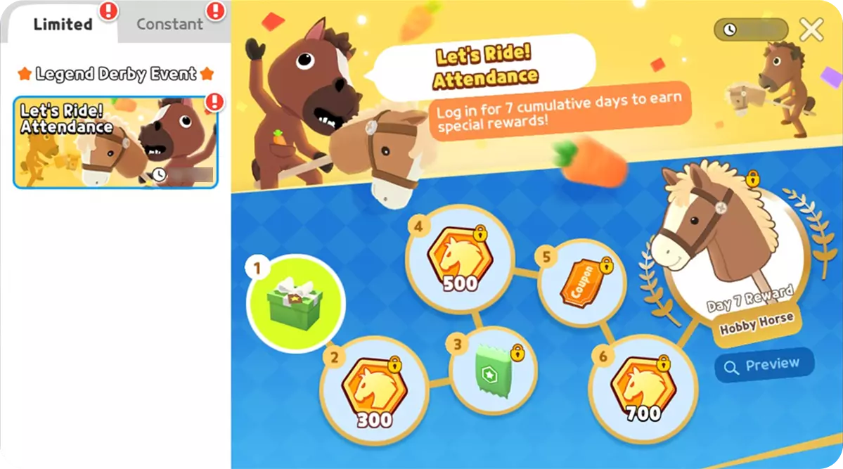 ▶ 骑行签到! 将举办签到活动,连续签到7天即可获得包括玩具马载具和天马硬币在内的多种奖励。 ※ 若未点击活动奖励进行签到盖章,则无法领取奖励——请务必记得盖章并领取奖励!