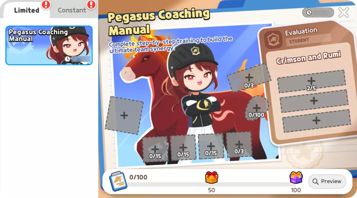 ※ 传奇德比活动期间:2月4日维护后 ~ 2月26日维护前 ※ 活动期间,广场道路将作为赛道使用,因此巴士将暂停运营。请留意。 ▶ 天马训练手册 完成循序渐进的训练任务,帮助露米和克里姆森找到合二为一的节奏。 根据任务完成进度,可获得天马硬币和天马骑行服装套装。