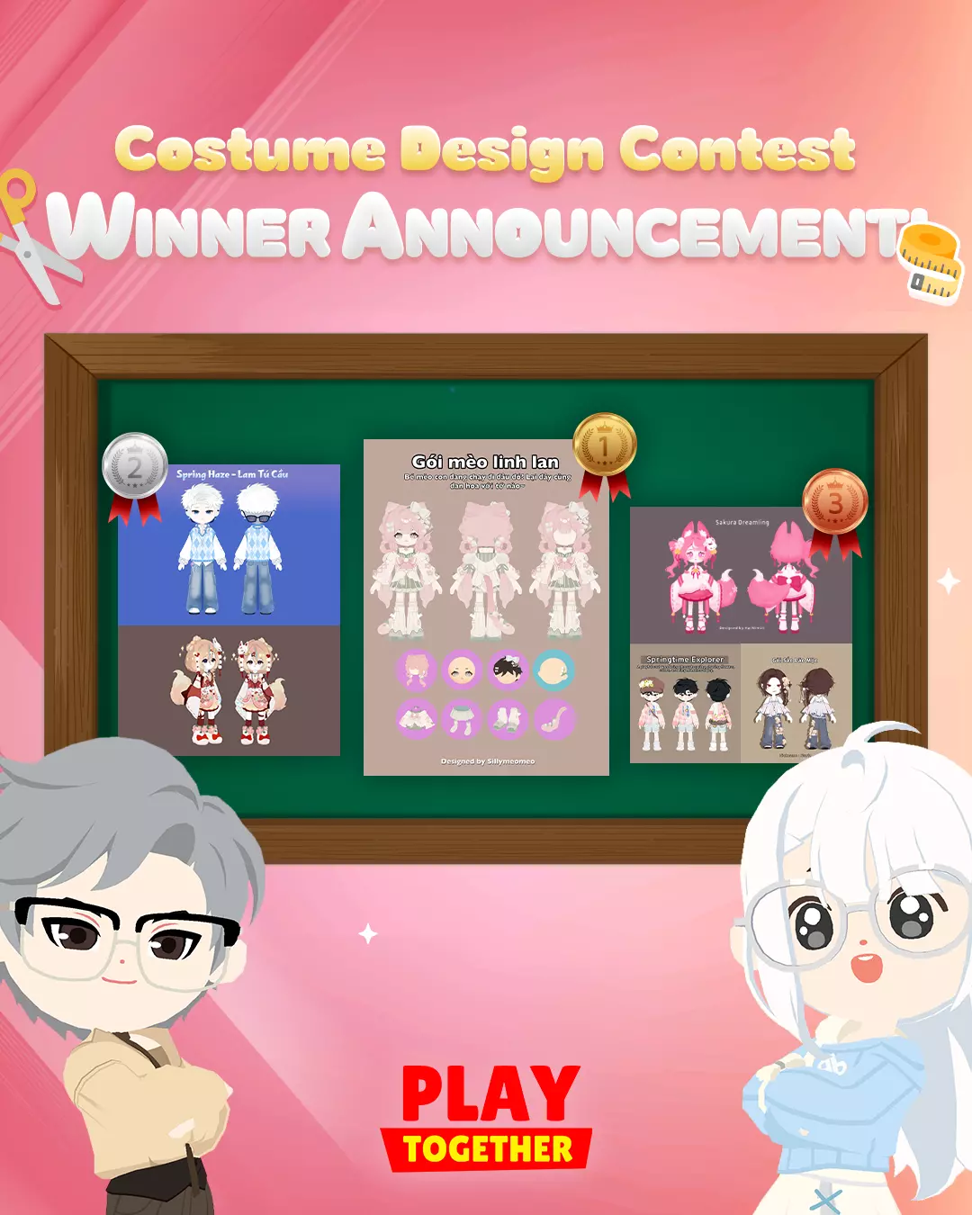 获奖者 活动奖励 第1名:3000宝石 sillymeo***(YMCZ-UDRL-****) 第2名:2000宝石 iamTo***(SM4F-GBRL-****) NgônNhấtChi***(JKCY-YUZL-****) 第3名:1000宝石 HạtNim***(PK4S-FV9L-****) NgBjn***(7M8F-AUHL-****) Sta***(7LEW-DU9L-****) 特别奖:500宝石 ʚˡᵖᵁ***(PM8C-EARL-****) 우*(LJBT-BTHL-****) ᴘᴀɴᴄᴀ***(CKBG-SC9L-****) 17***(6J4E-B4ZL-****) アルティメット***(8KFD-B3RL-****) She***(UKCY-X4RL-****) 않*(NM6A-TSRL-****) 蹲ᕙ等下hiênLon***(FK3V-GSHL-****) 投票奖励 1个幸运宝石盒 奖励发放日期 1月13日 ※请注意 - 奖励将发送至游戏内收件箱。若您未在奖励到期日前领取奖励,该奖励将不再可用,我们也无法提供进一步协助。 - 若您在奖励发放前更改角色名称,将无法领取奖励。 - 若您未收到奖励,请联系PLAY TOGETHER客服咨询。 *PLAY TOGETHER客服:http://support@playtogether.zendesk.com *Play Together VNG客服支持:cs.studio9@vng.com.vn - 若通过欺诈手段参与活动,一经发现,可能会取消您的获奖资格。 - 若物品名称不符合版权、运营政策或游戏理念,其名称可能会被更改。- 所选设计的制作日期尚未确定,且可能因内部情况导致无法制作。 - 所选设计可能会因内部情况进行修改或重新设计。 - 即使提交的设计未在本次活动中被选中,日后仍有可能作为其他服装推出。 - 若提交的设计作为游戏内道具推出,设计者将获得免费兑换券。该免费兑换券将通过提交的电子邮箱发放,并在产品发布日期后24小时内寄出。 我们承诺将尽最大努力让您在凯亚岛拥有愉快的生活。