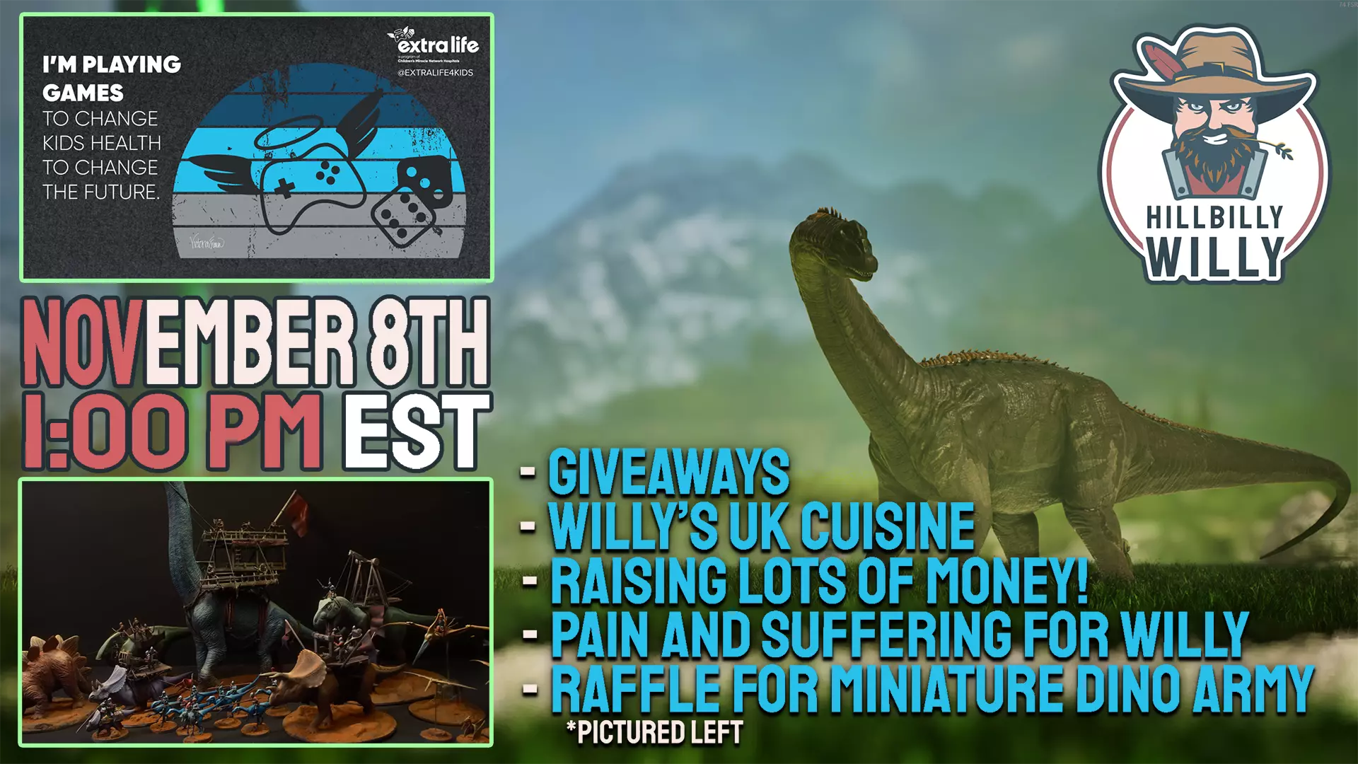 派对将于太平洋标准时间11月8日上午10点开始,为“生命接力游戏日”助力!快来捐款帮助孩子们,就有机会获得一些超棒的、独一无二的物品,包括由出色的Boylei Hobby Time YouTube频道提供的一套完全定制打造并涂装的恐龙军队模型。 想了解更多信息,请加入HillBillyWilly的Discord。 你可以在Twitch和YouTube上关注HillBillyWilly。